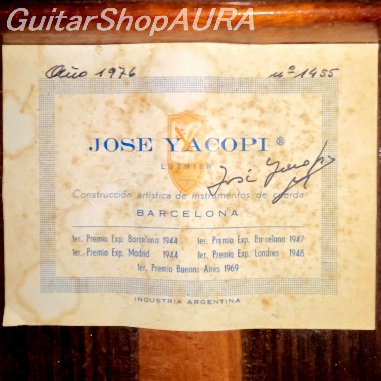 ホセ・ヤコピ(1916~2006)。スペインのビトリア生まれ。父親のガマリエル・ヤコピの工房に入り、18歳の時に最初のギターを製作しています。1949年には家族でアルゼンチンのブエノス・アイレスにほど近いサン・フェルナンドに移り住んで工房を開き、そこで生涯ギターを作り続けました。最初は父親と同様にアントニオ・デ・トーレスを規範とした伝統的なスペインギターを製作していましたが、移住する直前の1947年ごろから父親と共に発案した、通常とは逆方向に放射状に配置された扇状力木構造を採用するようになり、これがこのブランドの特徴となります。本国アルゼンチンではその需要の増大に対応するために工房品含め年間約300本のギターを出荷していた時期もありますが、最上位モデルはその1割ほどで、良質な材を使用して本人が製作しています。