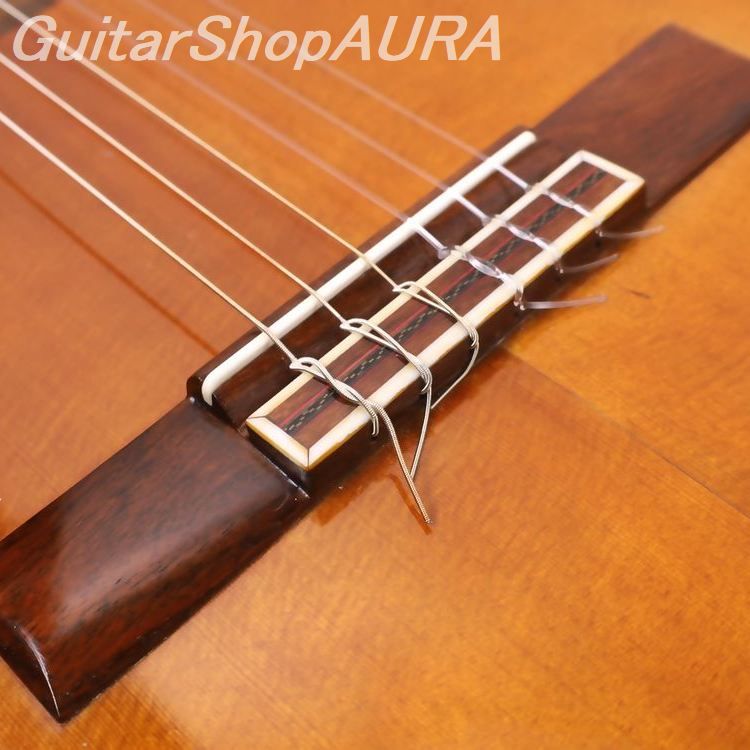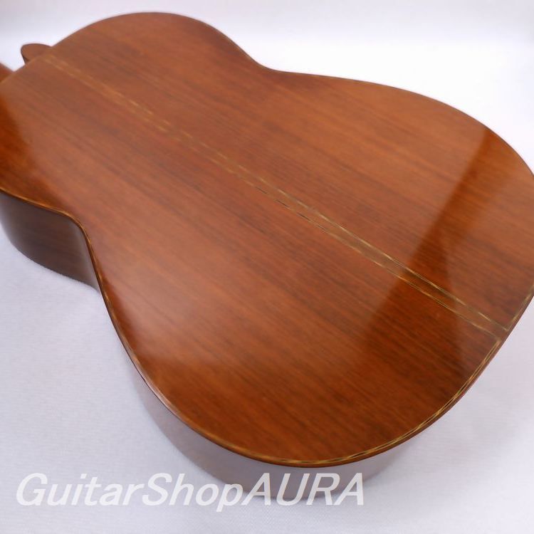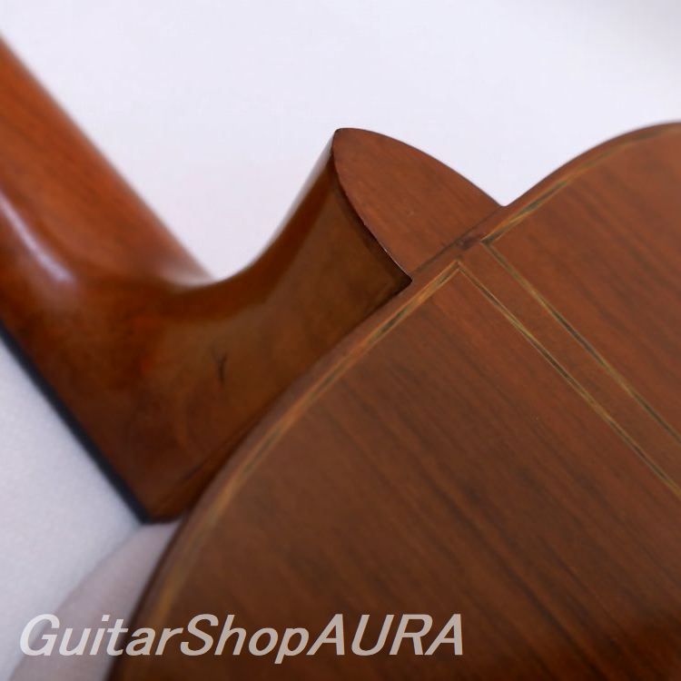ネック:セドロ指 板:エボニー塗 装:表板/セラック :横裏板/セラック糸 巻:ヤコピ オリジナル弦 高:1弦 2.7mm :6弦 3.5mm[製作家情報]ホセ・ヤコピ(1916~2006)。スペインのビトリア生まれ。父親のガマリエル・ヤコピの工房に入り、18歳の時に最初のギターを製作しています。1949年には家族でアルゼンチンのブエノス・アイレスにほど近いサン・フェルナンドに移り住んで工房を開き、そこで生涯ギターを作り続けました。最初は父親と同様にアントニオ・デ・トーレスを規範とした伝統的なスペインギターを製作していましたが、移住する直前の1947年ごろから父親と共に発案した、通常とは逆方向に放射状に配置された扇状力木構造を採用するようになり、これがこのブランドの特徴となります。本国アルゼンチンではその需要の増大に対応するために工房品含め年間約300本のギターを出荷していた時期もありますが、最上位モデルはその1割ほどで、良質な材を使用して本人が製作しています。非常に独特な音響と音色を備えており、中低音から低音にかけての重厚で柔らく、奥行きのある深い響きと引き締まって艶やかな高音との対比とバランスが素晴らしく、ポリフォニックな曲を演奏した時の立体感は他のギターでは味わえない魅力があります。また音色には南米的な澄んだ色気があり、これが古典と現代の両方の雰囲気を併せ持つことから、クラシック奏者からポピュラー音楽までの幅広いユーザーに愛されてきました。マリア・ルイサ・アニードやエドゥアルド・ファルーらが愛用し、また近年ではボサノヴァや南米音楽の愛好家にも絶大な支持を受けています。現在は息子のフェルナンド・ヤコピが工房を継いでいますが、ファンの間ではやはり1960年代から亡くなる前の1990年代までのJose本人による楽器に人気が集中しています。[楽器情報]ホセ・ヤコピ製作 1976年製 No.1455 Usedの入荷です。1960~70年代の人気の高い時期の一本。ヤコピのイメージとして定着している琥珀色の塗装で仕上げられた外観はフォトジェニックで、全体にどっしりと落ち着いた佇まい。実際に通常のモデルよりも響箱はやや大き目に作られています(ただし演奏性に関するサイズ設定は通常仕様となっています)。特徴的な低音は太く耳に柔らかい感触があり、対して高音は1音1音に芯がしっかり通った、明確で強い表情を備えており、その対比とバランスによる音楽的な表現力は他にはない魅力を放っています。内部構造は胴底のフットブロックを頂点とするように配された左右対称6本の扇状力木で、通常の扇状力木とは開く方向が逆になっているヤコピ特有の構造(センターのマッチング部分は力木の代わりに小さなパッチ板が十数枚貼られており、これもヤコピの標準的な仕様)。レゾナンスはGの少し下に設定されています。特に割れや改造等の大きな修理履歴はありません。弾き傷等の状態に関しても浅く細かなものが全体にまんべんなく見られますが年代を考慮すると少なめです。糸巻はオリジナルのものを装着しており(つまみは貝殻型ではなく、蟹型のもの)現状でも機能的に良好です。ネックはほんのわずかに順反りですが標準設定の範囲内で特に問題ありません。ネック形状は普通の厚みのDシェイプ、弦高値は2.7/3.5mm(1弦/6弦 12フレット)でサドル余剰は1.0~1.5mmあります。
