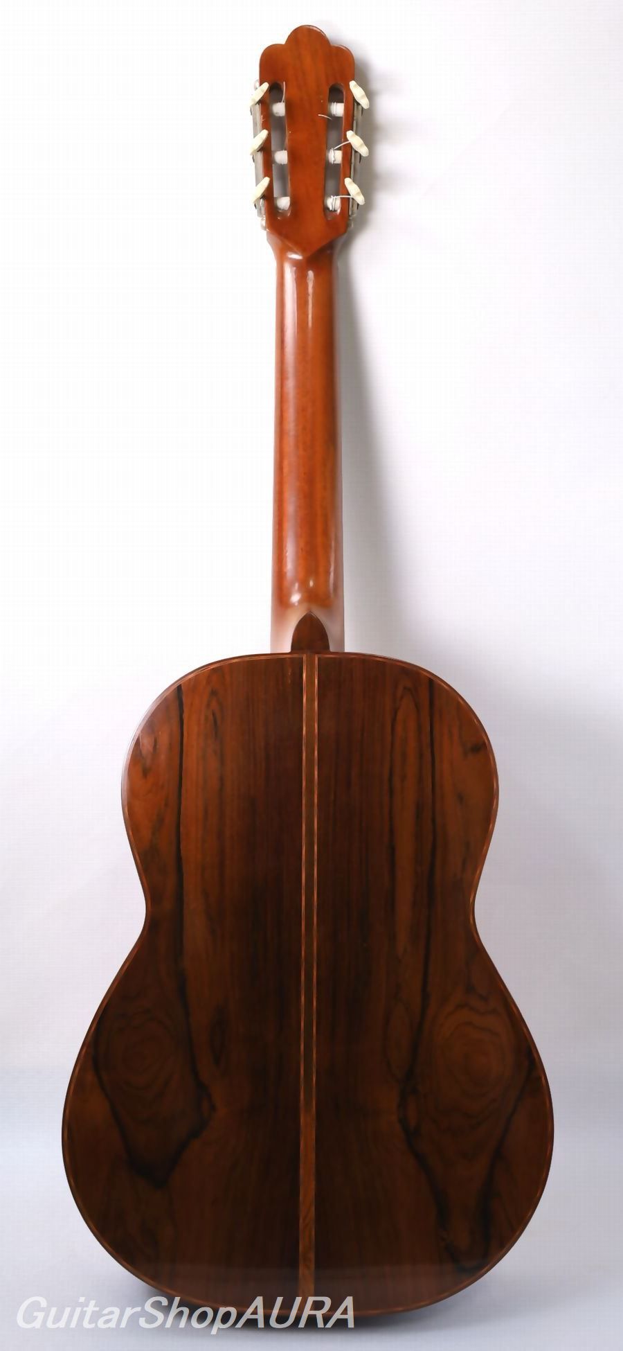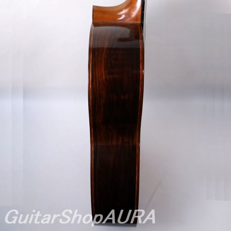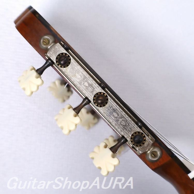 内部構造はヤコピ特有の逆扇状力木構造で、レゾナンスはG#の下に設定されています。全面セラックニス仕上げで、ブランドオリジナルデザインの口輪、オリジナルの糸巻きが装着されており機能良好です。