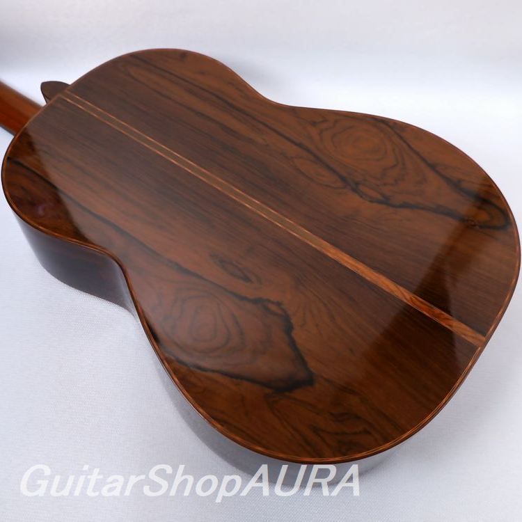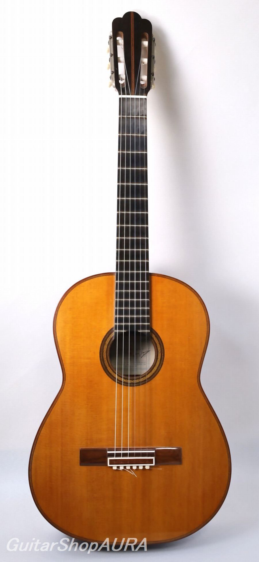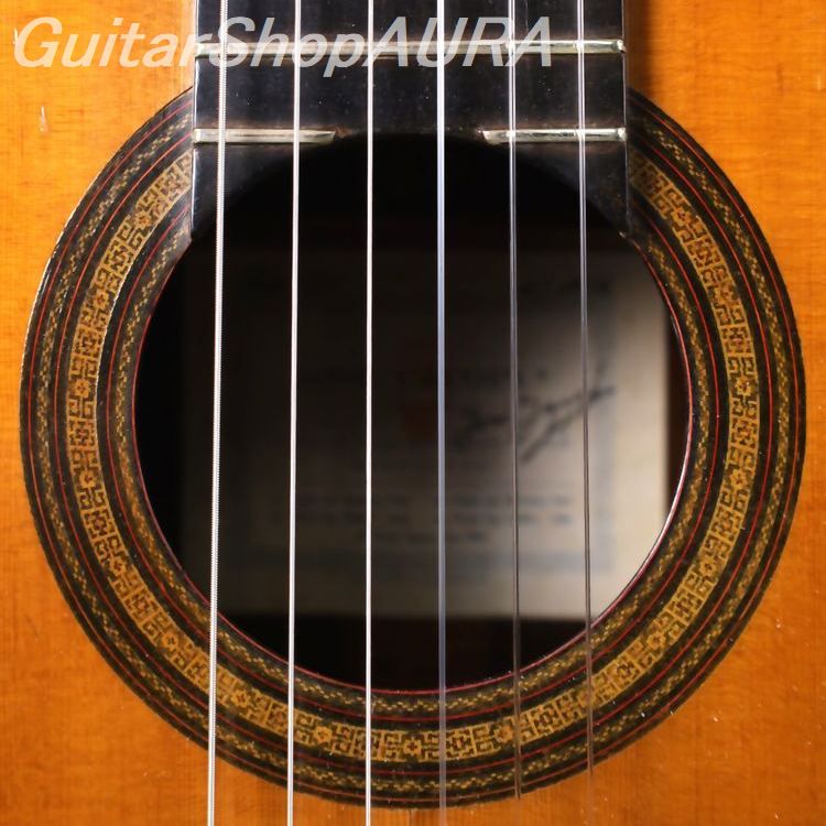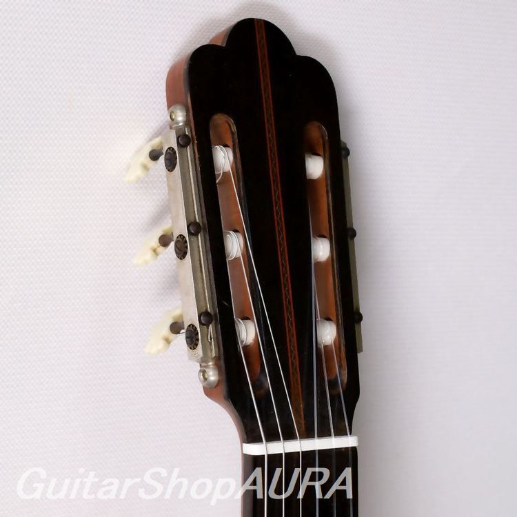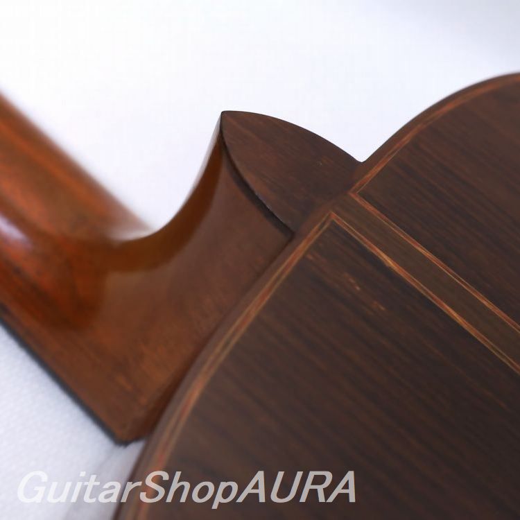 ネック:セドロ指 板:エボニー塗 装:表板:セラック :横裏板:セラック糸 巻:オリジナル弦 高:1弦 3.2mm :6弦 4.0mm〔製作家情報〕ホセ・ヤコピ(1916~2006)。スペインのビトリア生まれ。父親のガマリエル・ヤコピの工房に入り、18歳の時に最初のギターを製作しています。1949年には家族でアルゼンチンのブエノス・アイレスにほど近いサン・フェルナンドに移り住んで工房を開き、そこで生涯ギターを作り続けました。最初は父親と同様にアントニオ・デ・トーレスを規範とした伝統的なスペインギターを製作していましたが、移住する直前の1947年ごろから父親と共に発案した、通常とは逆方向に放射状に配置された扇状力木構造を採用するようになり、これがこのブランドの特徴となります。本国アルゼンチンではその需要の増大に対応するために工房品含め年間約300本のギターを出荷していた時期もありますが、最上位モデルはその1割ほどで、良質な材を使用して本人が製作しています。非常に独特な音響と音色を備えており、中低音から低音にかけての重厚で柔らかく、奥行きのある深い響きと引き締まって艶やかな高音との対比とバランスが素晴らしく、ポリフォニックな曲を演奏した時の立体感は他のギターでは味わえない魅力があります。また音色には南米的な澄んだ色気があり、これが古典と現代の両方の雰囲気を併せ持つことから、クラシック奏者からポピュラー音楽までの幅広いユーザーに愛されてきました。マリア・ルイサ・アニードやエドゥアルド・ファルーらが愛用し、また近年ではボサノヴァや南米音楽の愛好家にも絶大な支持を受けています。現在は息子のフェルナンド・ヤコピが工房を継いでいますが、ファンの間ではやはり1960年代から亡くなる前の1990年代までのJose本人による楽器に人気が集中しています。〔楽器情報〕1976年製作のNo.1456です。弦長650mmで設定されています。1960~70年代の人気が高い時期の一本です。全体にふっくらとした包容力のある木質の響きで、南米的なニュアンスたっぷりの音色が特徴です。あくまでも慎ましさを保ちながらしかし豊かに鳴っており、包容力のある低音~中低音ときりっとした感触の高音との対比に妙があります。レスポンスも良好で、ポリフォニックな曲を演奏した時の立体感は他のギターでは味わえない魅力です。内部構造はヤコピ特有の逆扇状力木構造で、レゾナンスはG#の下に設定されています。全面セラックニス仕上げで、ブランドオリジナルデザインの口輪、オリジナルの糸巻きが装着されており機能良好です。ネックは薄めのDシェイプで角の取れた形状、弦の張りは中庸で、両手ともストレスをあまり感じない弾きやすさです。ネックはやや順反りで演奏性は良好、フレットは適正値を維持しています。弦高値は1弦3.2mm、6弦4.0mmで調整されており、サドル余剰は0.5mmです。製作から50年を経過した楽器としては良好な状態を保っています。表面板は細かな弾き傷、掻き傷、打痕など、横裏板は衣服等による擦れがありますが、細かく浅いものがほとんどで外観を損ねるほどではありません。塗装はおそらくオリジナルを保持しており、割れなどの大きな修理履歴はありません。おそらくフレットは交換歴がありますが、きちんとメンテナンスされてきたことが伺えます。ハードケースが付属します。
