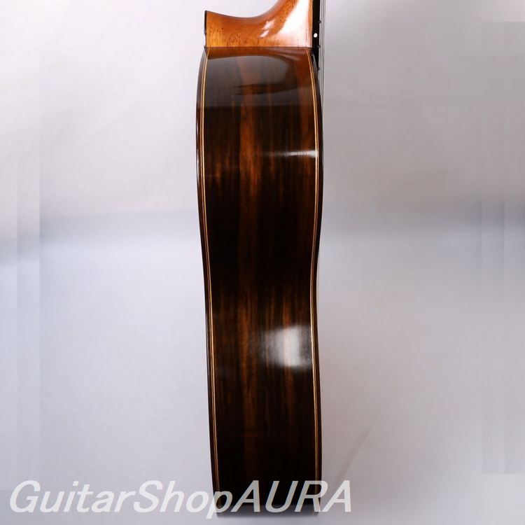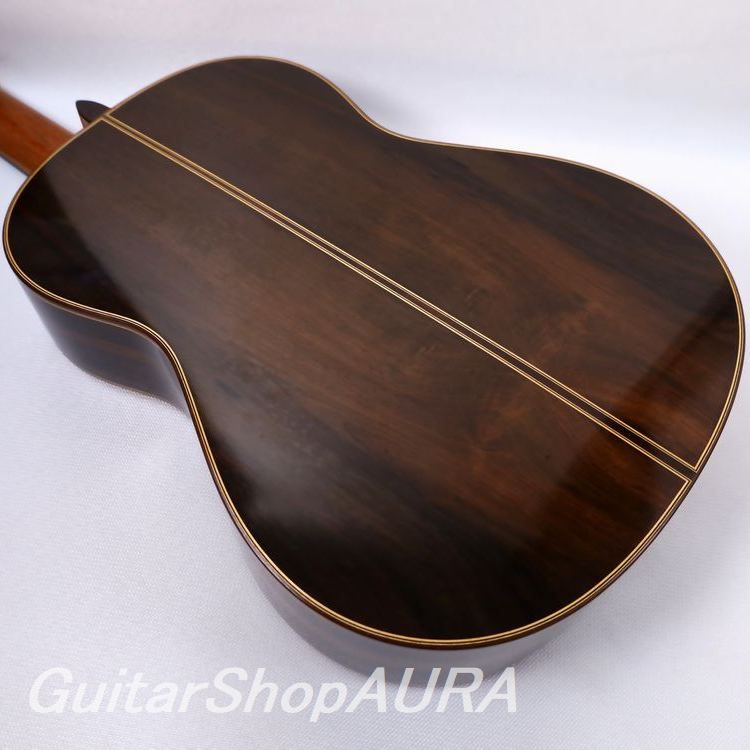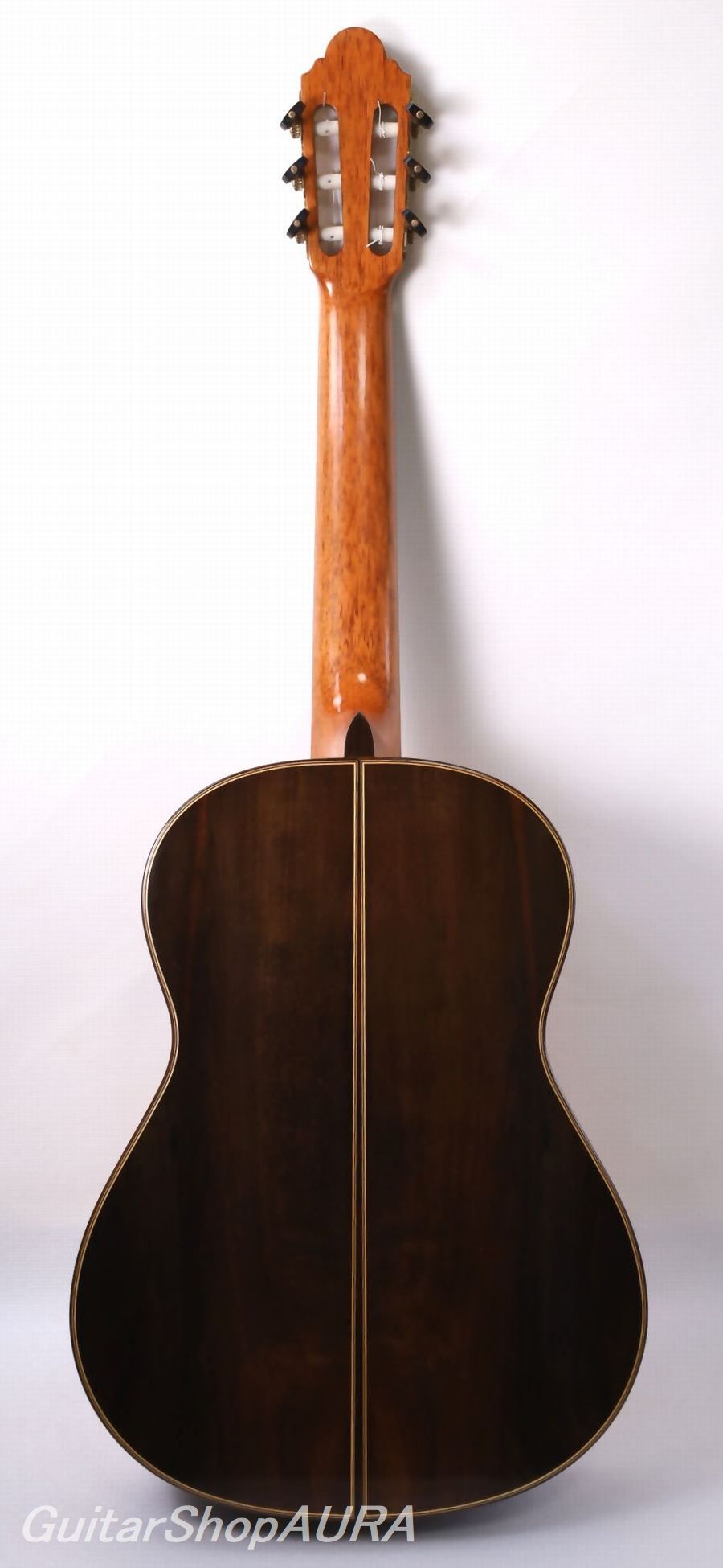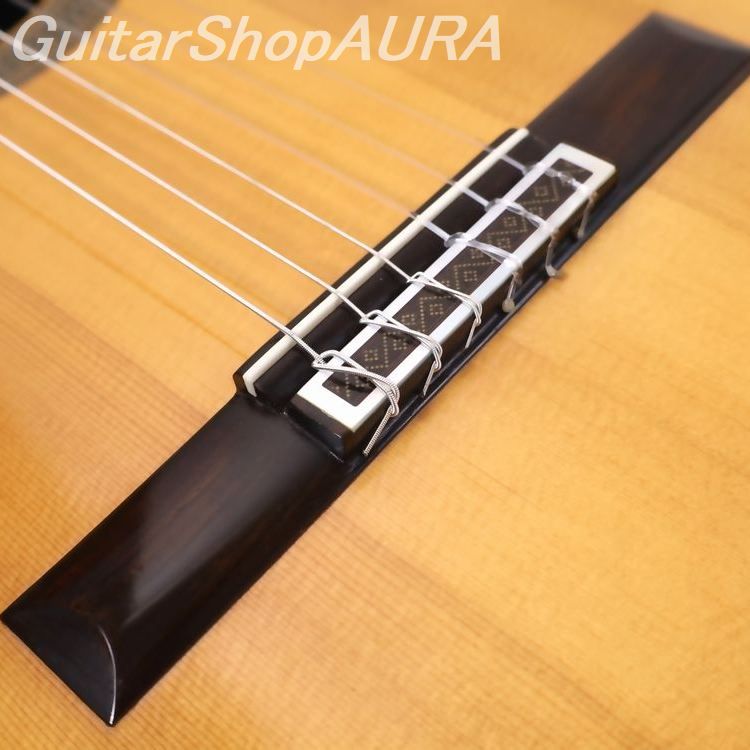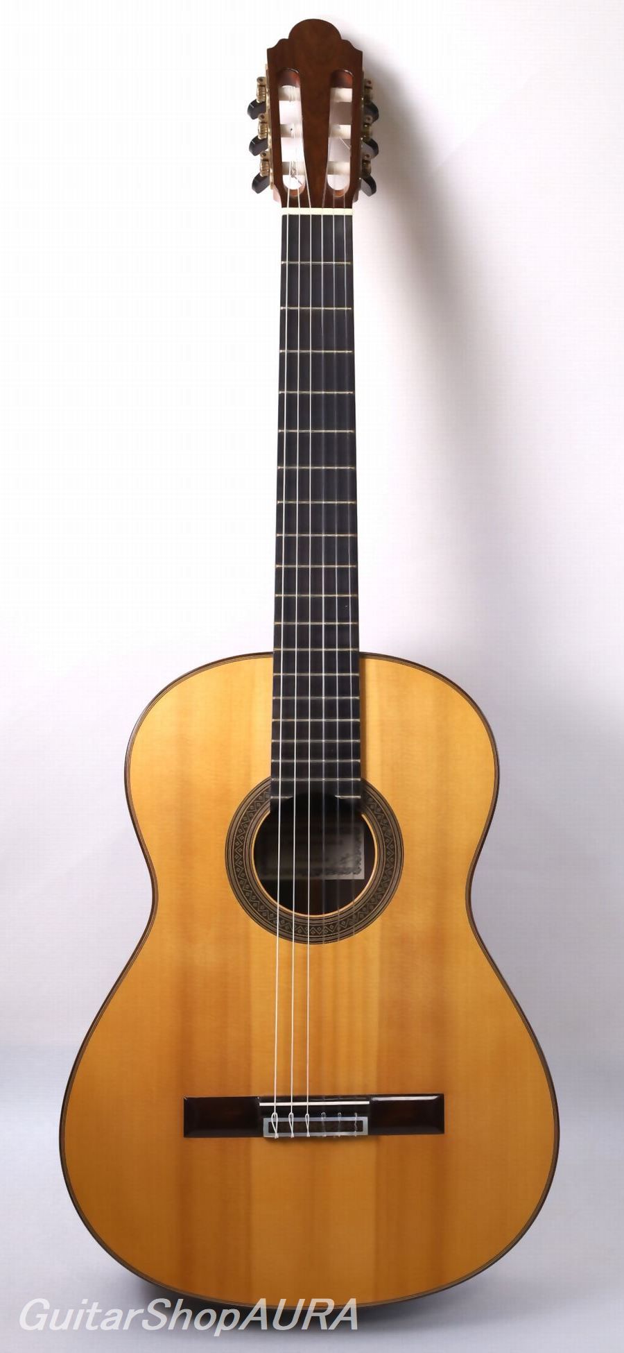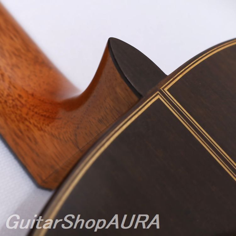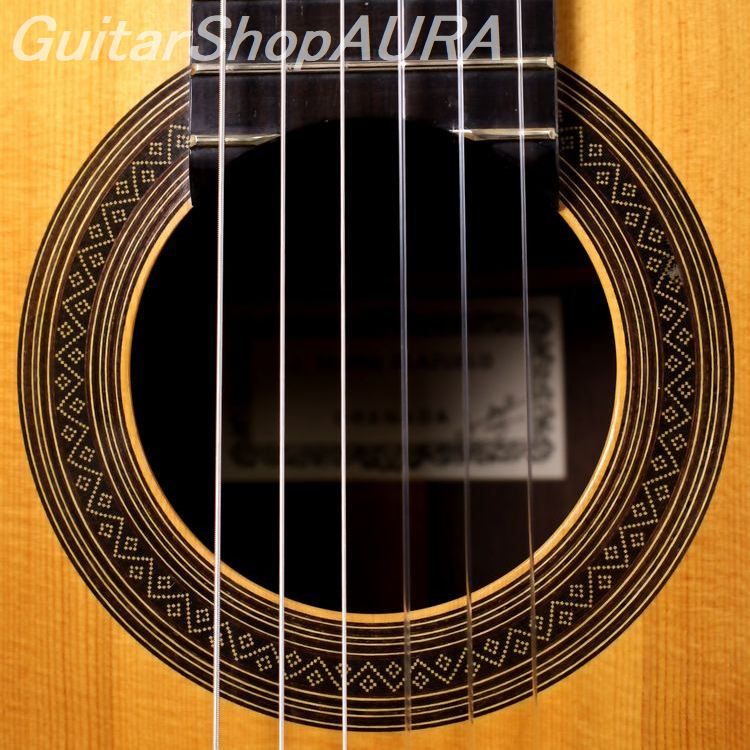 ネック:セドロ指 板:黒檀塗 装:表板 セラック :横裏板 セラック糸 巻:ルブナー弦 高:1弦 2.3mm/6弦 3.3mm〔製作家情報〕1960年、スペイン・グラナダ生まれ。14歳で伯父アントニオ・マリン・モンテロの工房に弟子入りし、10年後の1984年より自身のラベルでギター製作を開始しました。以降現在に至るまで、アントニオと同じ工房にて製作を続け、スペインギター屈指の名品を世に送り出す工房として国際的に高い評価を得ています。「グラナダ的音色」と聞いて多くの人が思い描くイメージに、最も円満に当てはまる製作家のひとりと言えるでしょう。豪壮さと繊細さを併せ持ち、抜けるような明朗さと深淵さを兼ね備えた音色はもちろんのこと、高い造作精度、精緻を極めた意匠、美しい塗装など、楽器としての完成度の高さにおいてもスペイン屈指の素晴らしさを誇ります。その魅力は、さまざまな音楽ジャンルの第一線で活躍する演奏家たちを刺激し続けています。〔楽器情報〕2004年製作、No.467。弦長は650mmに設定されています。製作から20年が経過し、色気をまとった枯れた音色が魅力の一本です。高い瞬発性と十分な音圧を備えつつ、長年弾き込まれることで適度な粘りが加わり、他のグラナダ派ブランドには見られない独特の明暗を併せ持つ音色に仕上がっています。音の伸びも良好で、全音域にわたってバランスが取れており、レスポンスの速さも印象的です。マリン工房特有の力強く高く抜けていく感覚をしっかりと保持しながら、そこにクラシカルな翳りを内包した響きが非常に魅力的な一本です。全面セラックニス仕上げ。糸巻きにはルブナー製を装着しています。ネックは真っ直ぐで演奏性は良好、フレットの摩耗もほとんど見られません。弦高は1弦2.3mm、6弦3.3mmと低めに調整されており、サドルの余剰も約1.5mmあるため、今後の調整にも対応可能です。弦の張りは比較的柔らかく、ネック形状も一般的で弾きやすいセッティングとなっています。使用感はありますが、大きく目立つ傷はありません。ネック裏全体には演奏に伴う細かな傷、サウンドホール付近に軽微な弾き傷、表板ネック継ぎ目付近の高音側に浅いひっかき傷が数か所見られますが、いずれも演奏使用によるもので、外観を大きく損なうものではありません。割れ等の修理履歴はなく、コンディションは良好です。黒色のハードケースが付属します。