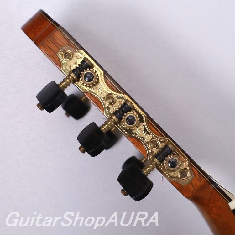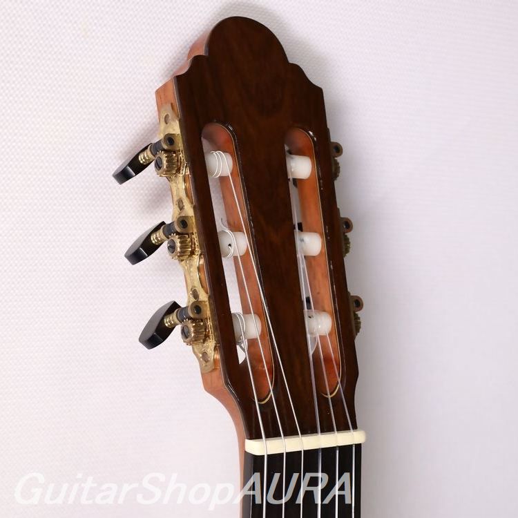 全面セラックニス仕上げ。糸巻きにはルブナー製を装着しています。ネックは真っ直ぐで演奏性は良好、フレットの摩耗もほとんど見られません。弦高は1弦2.3mm、6弦3.3mmと低めに調整されており、サドルの余剰も約1.5mmあるため、今後の調整にも対応可能です。弦の張りは比較的柔らかく、ネック形状も一般的で弾きやすいセッティングとなっています。