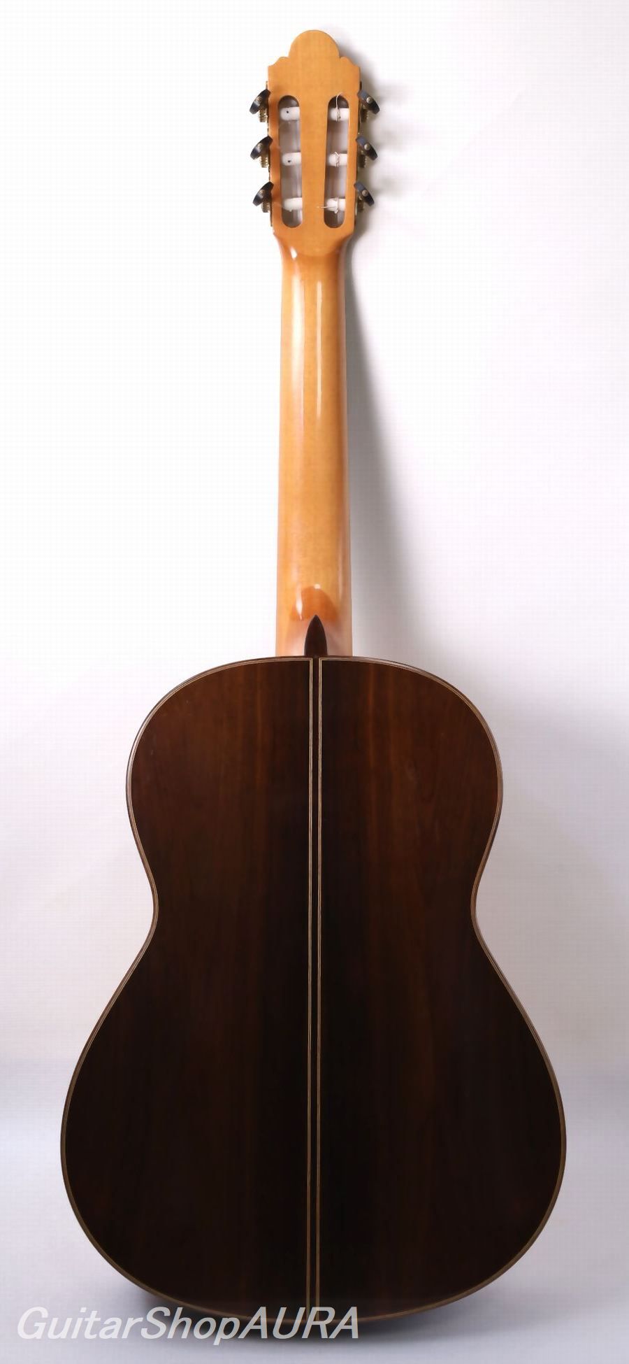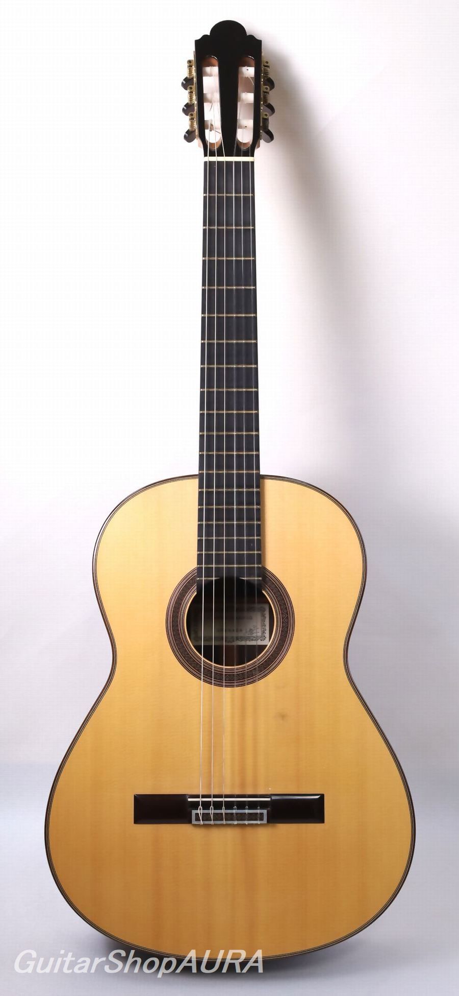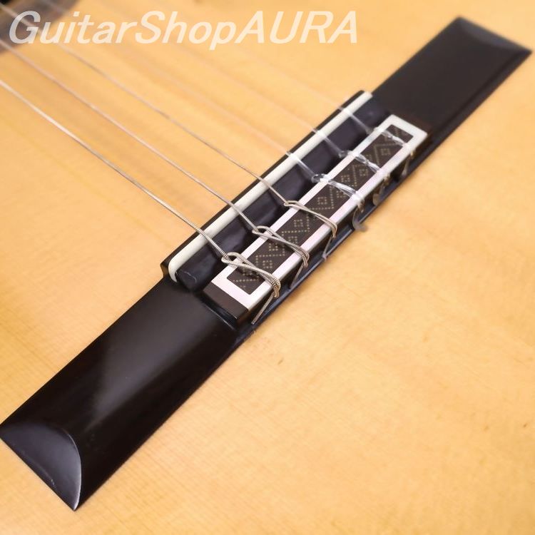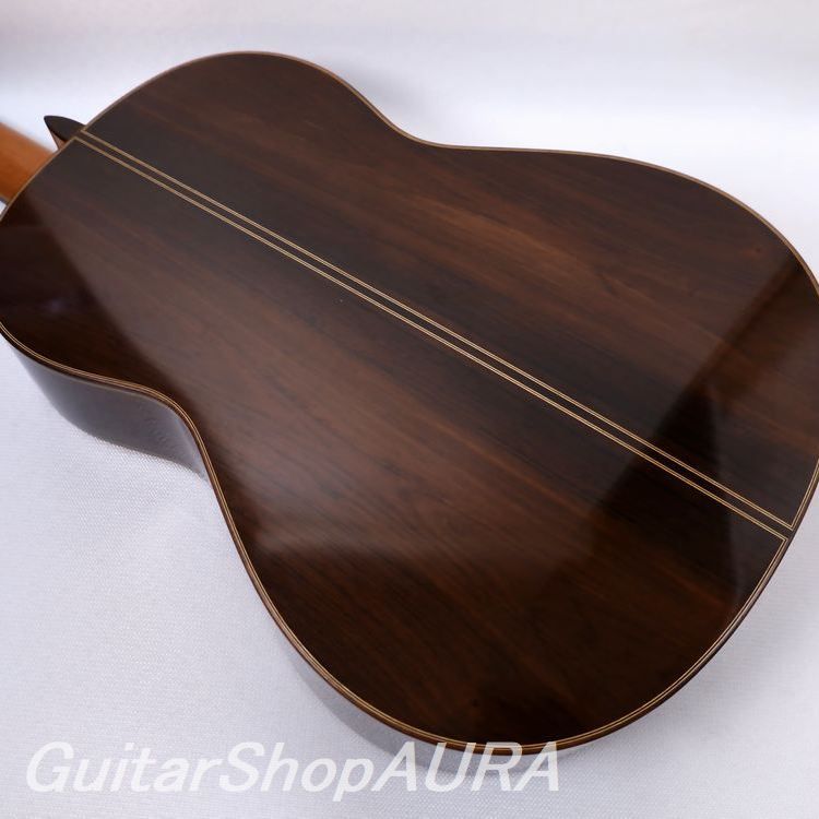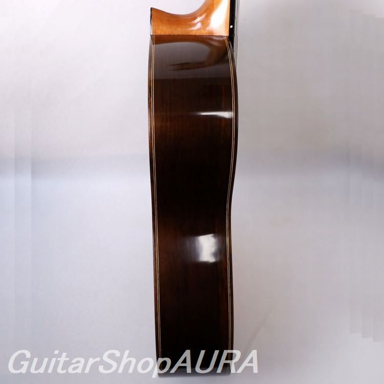 ネック:セドロ指 板:黒檀塗 装:表板 セラック :横裏板 セラック糸 巻:ルブナー弦 高:1弦 2.8mm/6弦 3.6mm〔製作家情報〕1960年、スペイン・グラナダ生まれ。14歳で伯父アントニオ・マリン・モンテロの工房に弟子入りし、10年後の1984年に自身のラベルによるギター製作を開始。その後現在に至るまで、アントニオと同じ工房で製作を続けており、同工房はスペインギター屈指の名品を世に送り出す存在として、国際的にも高い評価を得ています。「グラナダ的音色」という言葉から多くの人が思い描くイメージに、最も円満に当てはまる製作家の一人と言えるでしょう。豪壮さと繊細さを併せ持ち、抜けるような明朗さと深みを兼ね備えた音色はもちろんのこと、高い造作精度、精緻を極めた意匠、美しい塗装など、楽器としての完成度の高さにおいてもスペイン屈指の素晴らしさを誇ります。その楽器は、ジャンルを問わず第一線で活躍する演奏家たちを刺激し続けています。〔楽器情報〕2013年製作の No.763。明るい音色を基調とし、軽い弾き味と高い瞬発性を備えたレスポンスの速さが印象的な一本です。音の伸びも良く、全音域にわたってバランスに優れています。ホセ・マリン特有のシャープな音の輪郭と、グラナダ工房ならではの力強く高く抜けていく響きが見事に表現されています。全面セラックニス仕上げで、糸巻きにはルブナー製を装着。ネックはわずかに順反りの標準的な状態で、演奏性は良好、フレットの摩耗もほとんど見られません。弦高は1弦 2.8mm、6弦 3.6mmに調整されており、サドルの余剰も約1.5mm残されているため、今後の調整にも対応可能です。弦の張りは比較的柔らかく、弾きやすいセッティングとなっています。製作から10年が経過しており、全体的に細かな傷が見られます。ネック裏全体には演奏時に生じたとみられる細かな擦り傷、サウンドホール付近には弾き傷と思われるひっかき傷が数か所、表面板ボトム部には浅い打痕が確認できますが、いずれも通常使用によるもので、外観を大きく損なうものではありません。割れ等の修理履歴はなく、コンディションは良好です。ヒスコックケース(黒)が付属します。