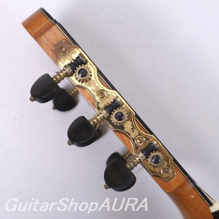 全面セラックニス仕上げで、糸巻きにはルブナー製を装着。ネックはわずかに順反りの標準的な状態で、演奏性は良好、フレットの摩耗もほとんど見られません。弦高は1弦 2.8mm、6弦 3.6mmに調整されており、サドルの余剰も約1.5mm残されているため、今後の調整にも対応可能です。弦の張りは比較的柔らかく、弾きやすいセッティングとなっています。