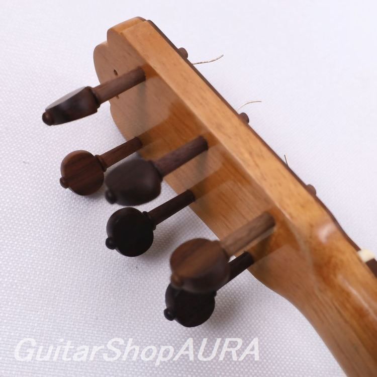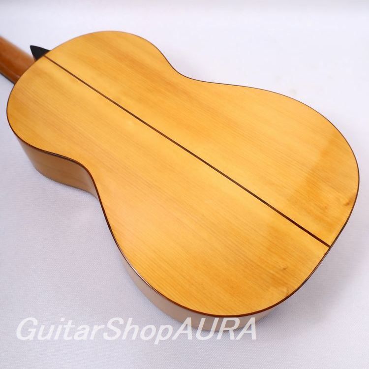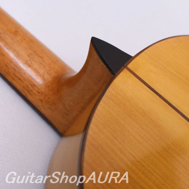 ジョアン・ペリッサ製作のトーレスモデル、アントニオ・デ・トーレス1887年製 SE109のコピーモデルです。ジョアン氏曰くトーレスの製作した中でも最もエコノミックなモデルであるこのオリジナルは、シープレス材によるボディ、マホガニーまたはローズウッドのヘッド、ネック、指板そしてブリッジプレート、糸巻きは木ペグ、極めてシンプルな装飾等々コンサート用に製作された充実したモデルと比べると明らかにクオリティは下がるものの、かえって最小限の素材の中にも最良の響きを有したこの銘工のエッセンスが感じられる一本とのこと。ジョアン氏製作のこの愛すべきコピーモデルはその「エコノミックな」面も忠実に再現しつつ、やはり現代のギターでは表現できない独特の古雅な味わいを備えたものとなっています。音は小柄なボディからは想像もつかないほどに太く豊かに鳴り、木質の生々しい響きが何とも心地よく、発音のレスポンスも申し分ありません。