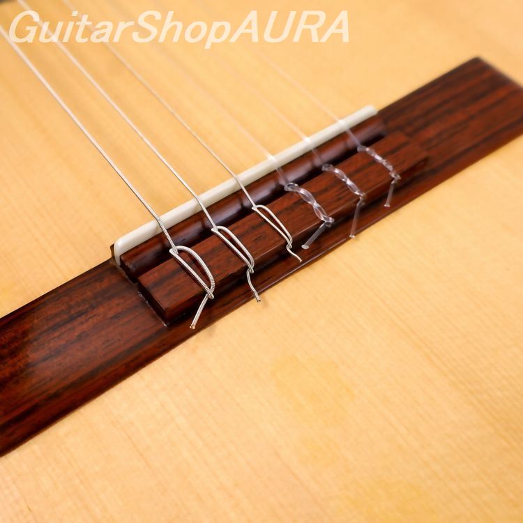 表面板力木構造は、サウンドホール上側(ネック側)に1本のハーモニックバーと薄く小さな1枚の補強プレート、下側(ブリッジ側)は1本のハーモニックバー、そして左右対称の5本の扇状力木というシンプルな配置で、ボトム部にクロージングバーのない設計になっています。レゾナンスはBの少し下に設定されています。