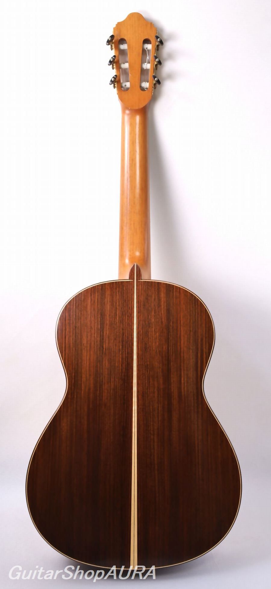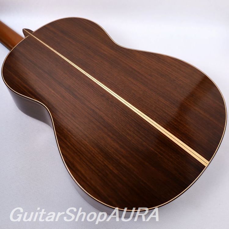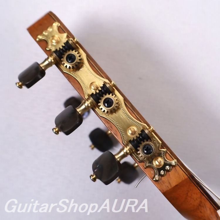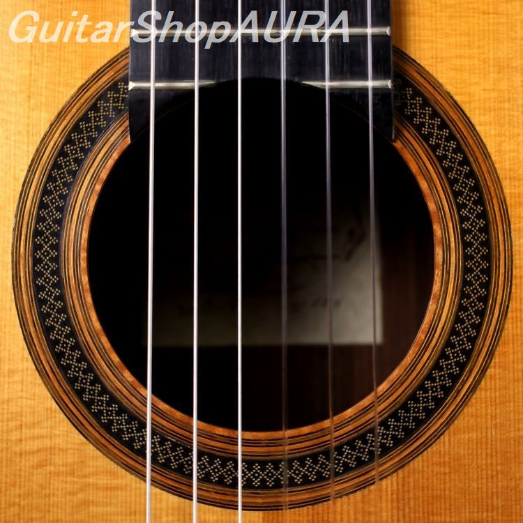 全体はセラックによるオリジナル出荷時のままの塗装。表面板は指板両脇やサウンドホールの高音側などに弾きキズ等がやや多くあり、また駒板下には弦交換時のものと思われるキズが少々あります。指板と表面板の接合部分(指板両脇とも)に軽微な割れを補修した履歴があります。横裏板は衣服等による摩擦あとがわずかにあるのみできれいな状態を維持しています。ネックはほんのわずかに順反りですが標準設定の範囲内、フレットは適正値を維持しています。ネック形状は薄めのDシェイプでコンパクトなグリップ感、弦高値は2.8/3.4mm(1弦/6弦 12フレット)でサドル余剰は高音側は0mm、低音側は1.0mmほどあります。糸巻はスペインの高級ブランド Fustero の フレタモデルを装着しており、現状で機能的な問題はなく良好です。全体の重量は1.57㎏。