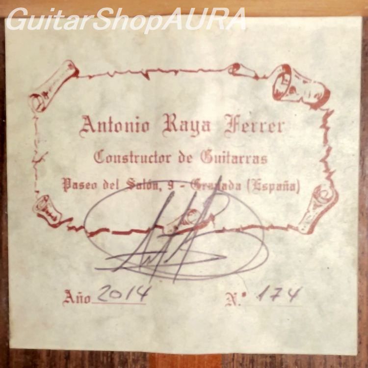アントニオ・ラジャ・フェレール Antonio Raya Ferrer 1980年 スペイン、グラナダの生まれ。現在も同地に工房を構え製作を行っています。父は同地を代表する製作家の一人として日本でも人気のあったアントニオ・ラジャ・パルド(1950~2022)、そして母ピラール・フェレールは現在のグラナダ派形成の最重要人物ともいえるエドゥアルド・フェレール(1905~1988)の孫娘であり、彼は文字通り物心つく前からこの二人の工房で製作する姿を見ながら育ったといいます。14歳の頃から父の工房で働き始め、17歳の時には自身のラベルで製作を開始。父親そしてグラナダの伝統に最大限の敬意を払いながら、慎ましくその継承者としての任を自覚している誠実な彼は、やはり父親同様にどこか柔和で素朴な作風が魅力的なブランドとして出発し、現在はあくまでも彼自身の成熟ゆえの帰結として、音響的そして造作精度的に高度の洗練を成し遂げた俊秀としての位置を確立しています。