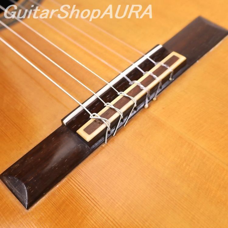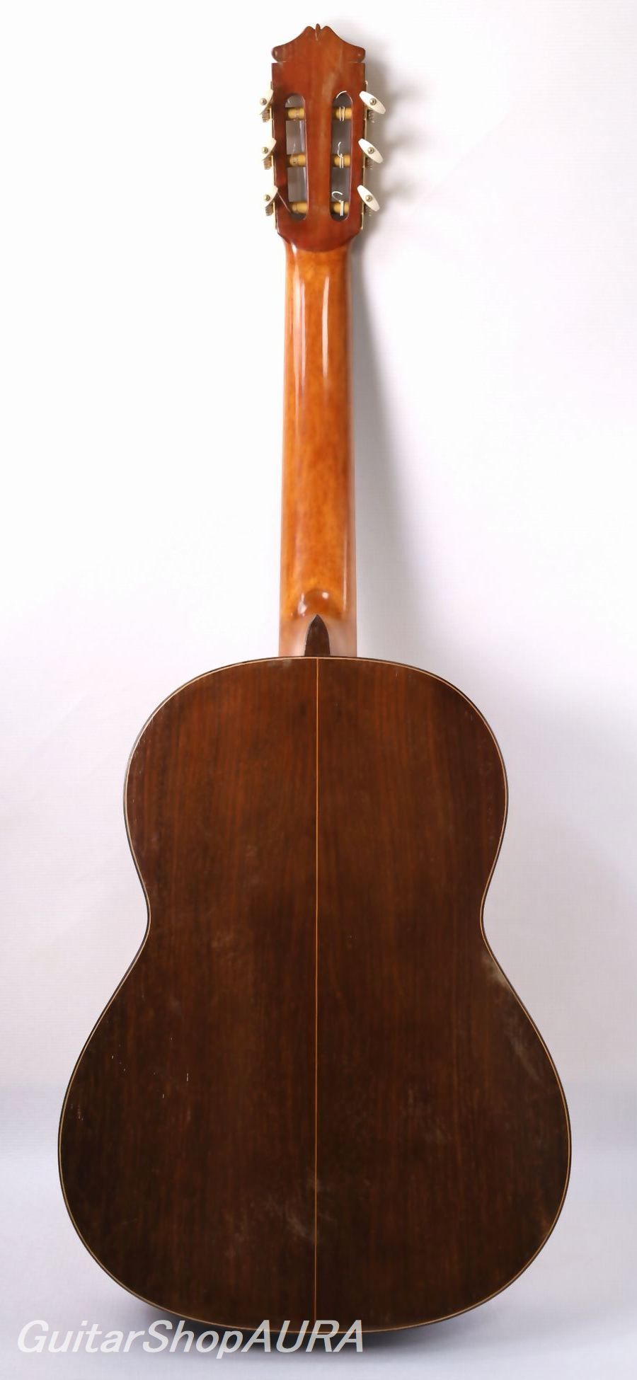 製作から70年を経た楽器としては非常に良好な状態を維持しています。割れはなく、表面板全体にキズ(特に指板両脇からサウンドホール周りにかけては弾き傷がやや多め)がありますがさほどに深いものではなく、適切な弾き込みによる経年の自然な使用感の範囲にとどまっています。横裏板(これも実にバルベロ好みの濃茶で柾目の中南米ローズウッド)は衣服の摩擦による細かな擦れあとや若干の塗装の白化のみとなっており、やはり経年考慮するときれいな状態といえます。ネック裏はおそらく過去に再塗装が施されており、現状はキズはほとんどなく良好です。ネックは真っすぐを維持しており、フレットは全体にやや摩耗していますが(特に1~4フレット)、演奏性には影響ありません。ネック形状は普通の厚みのDシェイプでフラットな加工がされています。糸巻は過去にGotoh製に交換されており、現状で機能的に良好です。ラベルには割り印でアルカンヘル名義のブランドスタンプが押印されており、同様のものが他にもネック脚部分と表面板内側サウンドホール脇にも押印されています。またネック脚部分には「19」の番号も押印されていますがこれについては不明(アルカンヘルによると本器はバルベロがストックしていた材をそのまま使用して作られているが、番号の意味は定かではないとのこと)。