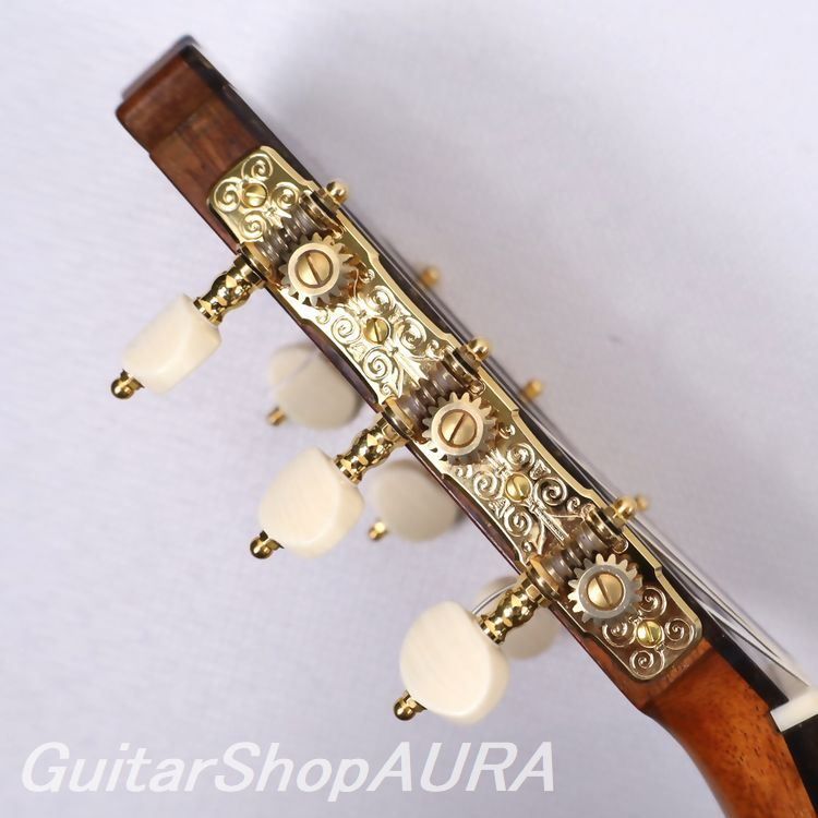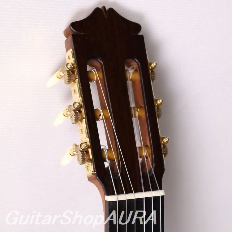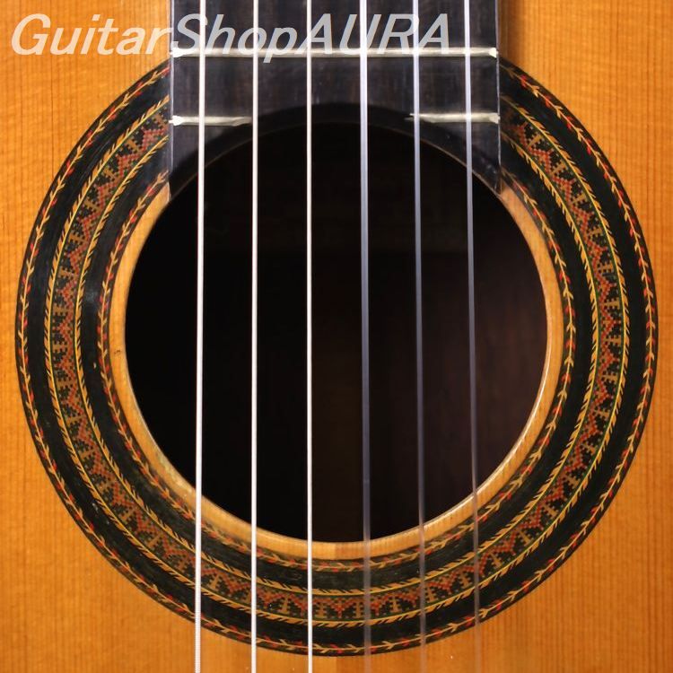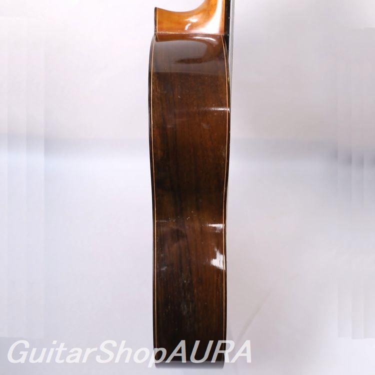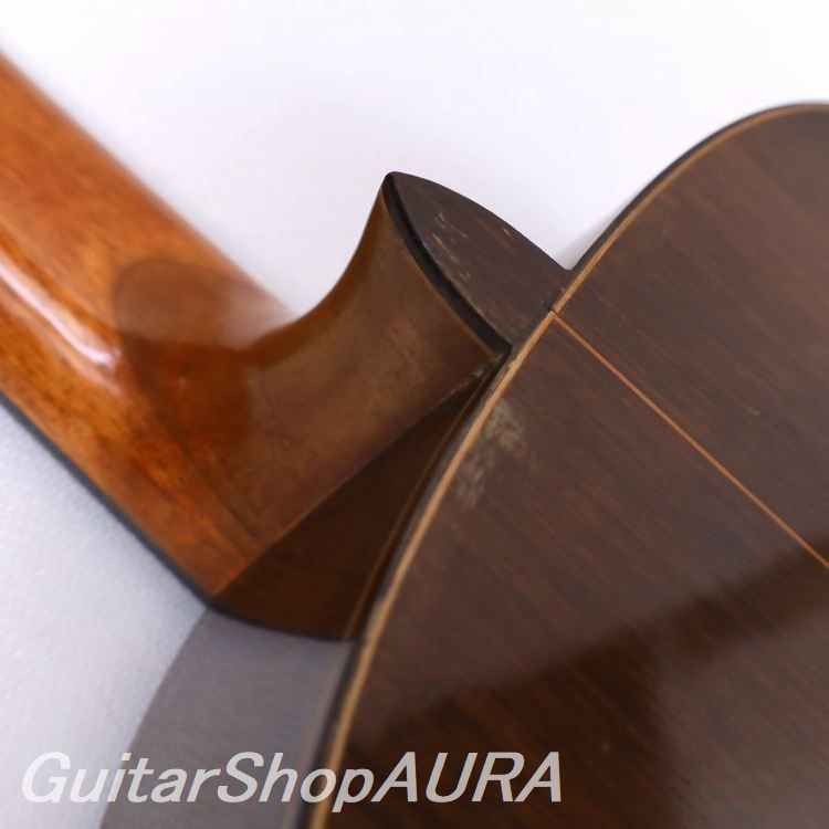 ビウダ・デ・マルセロ・バルベロ 1956年製 クラシックモデルです。ラベルには(Arcangel Fernandez)とプリントされており、マルセロ・バルベロ1世の未完の楽器を弟子であるアルカンヘル・フェルナンデスが仕上げた1本。「ビウダ・デ ~」のラベルが付された同様のモデルは全部で8本あり、そのうち5本はフラメンコ、3本がクラシックとなります。本作はその3本のクラシックモデルのうちの一本、アルカンヘル本人によるとバルベロが急逝した直後に製作したもので、すべてのパーツはバルベロが実際に残していたものを使用しているとのこと。いかにもマルセロが好みそうな(審美的というよりもトーンウッドとしての性質的に)材によって作られており、もちろんボディ形状、ロゼッタやヘッドデザインそして内部構造に至るまでがマルセロ・バルベロのオリジナルスタイルで見事に仕上げられています。