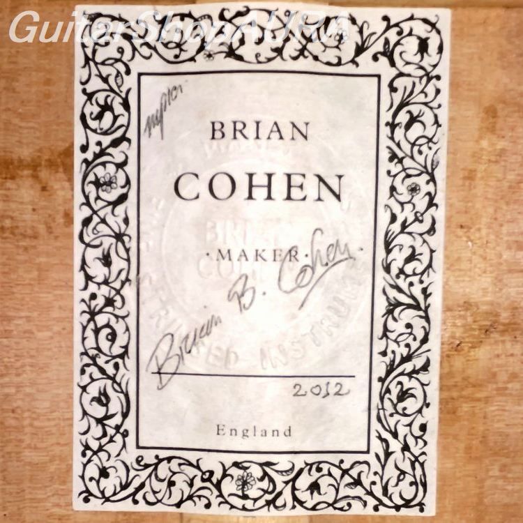 ブライアン・コーエン Brian Cohen 南アフリカ共和国出身、現在はイングランド、サリー州のギルフォードに工房を構える楽器製作家で、古楽器から現代までの弦楽器全般とクラシックギター、アコースティックギターを製作しています。南アフリカ時代の1972年から独学でギター製作と修理を始め、同地を演奏旅行で訪れたSergio と Eduardo の Abreu 兄弟(日本では通例「アブリュー」と記されていますが「アブレウ」のほうが正しいとされており、英語圏でも「アブレイユ」と発音されることがほとんど)が使用したデビッド・ホセ・ルビオ(1934~2000)のギター修理を手がけたことを機に、製作家として身を立てることを決意、1974年にルビオの工房があるイギリスへと渡ります。当時まだ未熟だった彼はルビオ工房の職人にはなれなかったものの、ルビオはこの若い製作家のためにアドバイスを与え、やがて一流の職人となった彼は自身の製作と平行してルビオ工房品の作業も行っています(特にルビオが亡くなるまでの10年間はほとんどの受注品を彼が組み立てていたとのこと)。