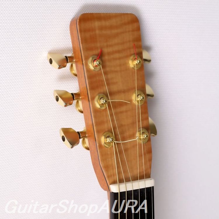 本作はコーエン氏がある映画の撮影用として製作し、撮影終了後は自身がストックしていたものを前オーナーが直接購入したもので、ワンオーナー品となります。傷は軽微なもののみでほとんどなく、割れや改造など大きな修復歴もありません。セラックの塗装は一部表面的なムラが見られる箇所がありますがこれも外観を損ねるほどではなく、全体にとてもきれいな状態を維持しています。ネック形状はこれも厳密にはMartinの仕様とは異なりますが、ほぼスタンダードと言えるCシェイプ、トラスロッド内臓のネックとなっており、現状で最適な設定になっています。ヘッドストックはソリッドタイプですがやはりMartin のスクエアな形状そのものではなく角の取れた柔らかいデザインになっています。糸巻は米国製 Sperzel のものを装着しています。