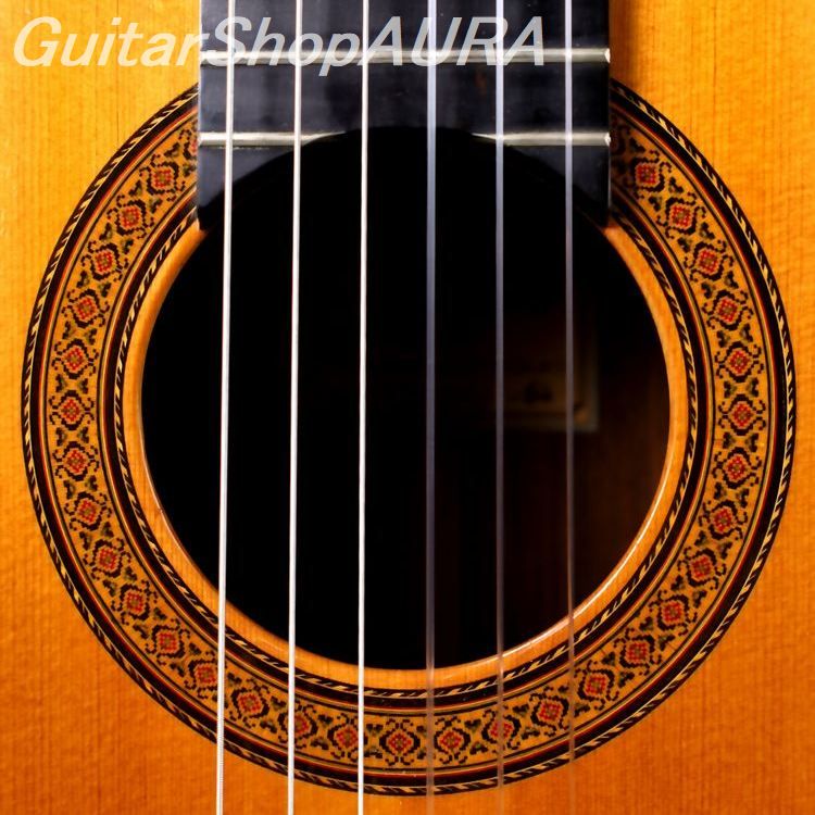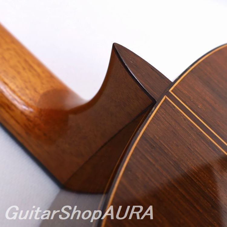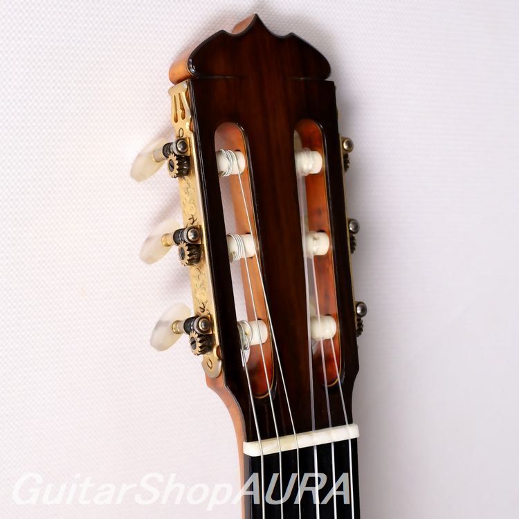 1964年は「1A」の原型がほぼ完全に出来上がっていた年で、この直後に表板が杉仕様、塗装はセラックニスからユリア樹脂へと仕様を変更し、あのラミレススタイルが確立します。本作は表面板に松材を使用し(横板は内側に別の木を貼り付ける2重仕様がすでに実装されています)、仕上げもセラック塗装など、1A プレスタイルともいえる1本ですが完成度の高さはさすがで、当時の工房の充実度がこの一本からも見て取ることができます。