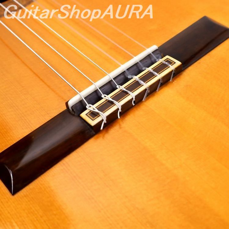 ネック:セドロ指 板:エボニー塗 装:表板 セラック :横裏板 セラック糸 巻:フステーロ弦 高:1弦 3.1mm / 6弦 4.8mm[製作家情報]ホセ・ラミレス Jose Ramirez スペイン、マドリッドのクラシックギターブランドで、ホセ・ラミレス1世(1858~1923)、2世(1885~1957)の時代から現在のホセ・ラミレス5世まで、1世紀以上に渡りスパニッシュギター製作史のなかで最も重要なブランドの一つとしてその名を刻み続けており、いまなおワールドワイドにマーケットを展開する工房です。なかでもとりわけ評価が高く「Ramirez dynasty」 と言われるほどに豊饒の時代とされたホセ・ラミレス3世(1922~1995)の時期に製作されたギターは、革新的でありながら幅広いポピュラリティを獲得し、世界中のギタリストとギターファンとを魅了し続けました。1950年代末から1960年代、パウリーノ・ベルナベ、マリアーノ・テサーノスといった名職人が職工長として働き、高級手工品の品質を維持しながら大量生産を可能した独自の工房システムを確立します。そして1964年にこのブランドのフラッグシップモデルとして世に出した「1A」は、表面板にそれまでの松材に代わって杉材を使用、胴の厚みを大きくとり、横板は内側にシープレス材を貼り付けた二重構造、弦長は664mmで設定(通常は650mm)、さらに塗装には従来のセラック塗装からユリア樹脂のものに変更し耐久性を飛躍的に増すとともに、「ラミレストーン」と呼ばれる独特の甘く艶やかな音色を生み出し、真っ赤にカラーリングされた印象的な外観と相まってクラシックギター史上空前のポピュラリティを獲得することになります。これらラミレス3世がクラシックギターに対して行った改革はマーケット戦略の面でも、また製作の面でも実に独創的でしかも時代の要請に十全に応じたもので、のちのギター製作全般に大きすぎるほどの影響を及ぼしたのと同時に、まさにクラシックギターのイメージを決定するほどに一世を風靡しました。ラミレス3世の息子4世(1953~2000)は18歳の時に父ラミレス3世の工房にて徒弟として働くようになり、1977年には正式に職人として認められます。1988年には妹のアマリアと共にブランドの経営を任されるようになり、父の製作哲学を引き継ぎながら、より時代のニーズに則した販売戦略(エステューディオモデルの製作、標準的な650mmスケールの採用等々)を展開しさらにシェアを拡大してゆきますが、3世亡き後わずか5年後の2000年にこの世を去ります。4世亡きあとアマリアは彼の意を継いでより柔軟な商品開発、生産ラインの監修、そして4世の子供たち、クリスティーナとホセ・エンリケの二人の姉弟の工房スタッフとしての教育に心血を注ぎます(二人は2006年から工房で働き始めています)。現在二人は正式にブランドを継承し、クリスティーナ(グラフィックデザイナー、音響技術者としての資格も有する)がマーケティングプロジェクト全般を、ホセ・エンリケが製作と工房運営を担当しています。名手アンドレス・セゴビアの名演と共にその音色が記憶に残る3世と4世の時代につくられたモデルは現在も人気があり、特に製作を担当した職人のイニシャルが刻印されていた1960年代のものは往年のファンに愛奏されています。〔楽器情報〕ホセ・ラミレス 3世 IMスタンプ 1964年製 クラシックモデル、ラベルに記載はありませんが、このブランドのフラッグシップモデルとしてこの後定着することになる「1A」にあたる、ラミレス最上位機種になります。よく知られているようにラミレス3世の工房では当時製作を担当したマスタービルダーのイニシャルがボディ内部にスタンプされており、本作「IM」はイグナシオ・マンサーノ・ロサス Ignacio Manzano Rozas 製作であることを示しています。ロサスは1961年から1970年までラミレス工房で働き、その後はマヌエル・コントレラスの工房で職工長として1989年まで精力的に製作に従事したあと満を持して1990年に自身の工房を設立、2008年に製作を引退しますが、マドリッドらしい豪壮さと渋めの音色が大変に魅力的な楽器で人気を博し、現在でもファンの多いスペインブランドの一つとなっています。1964年は「1A」の原型がほぼ完全に出来上がっていた年で、この直後に表板が杉仕様、塗装はセラックニスからユリア樹脂へと仕様を変更し、あのラミレススタイルが確立します。本作は表面板に松材を使用し(横板は内側に別の木を貼り付ける2重仕様がすでに実装されています)、仕上げもセラック塗装など、1A プレスタイルともいえる1本ですが完成度の高さはさすがで、当時の工房の充実度がこの一本からも見て取ることができます。表面板の力木構造もここですでに1A モデルの定式が確立しています。サウンドホール上側(ネック側)に1本のハーモニックバー、下側には同じく一本の横方向のハーモニックバーとほぼその中央で斜めに交差する(低音側横板上部から高音側横板下部に向かって)もう一本のバーが設置されており、この3本のバーはそれぞれ低音側に高さ2mm