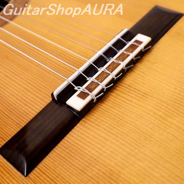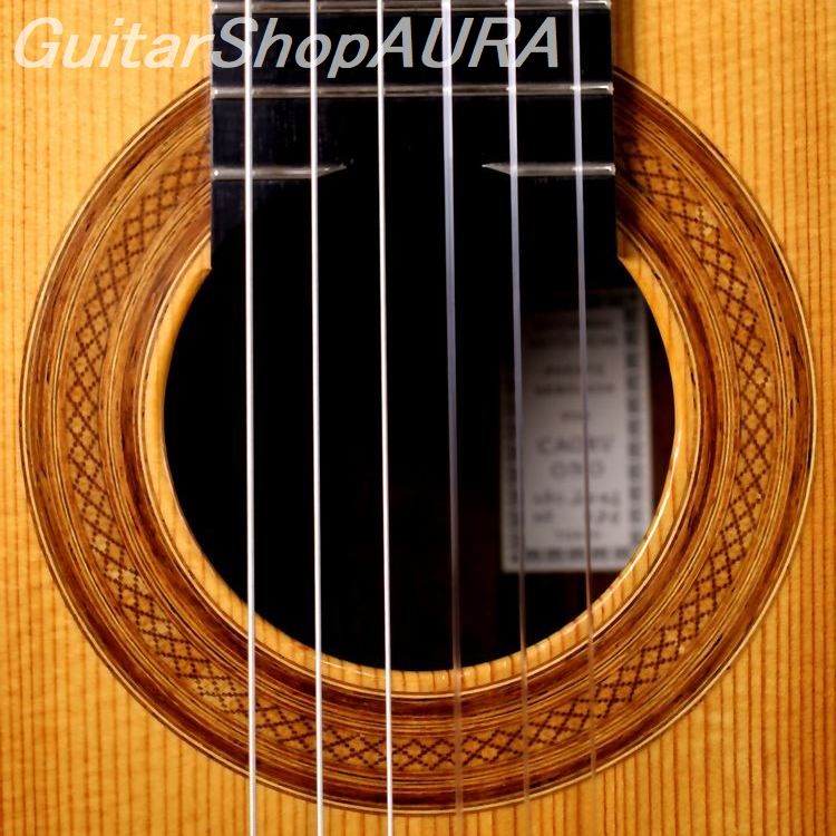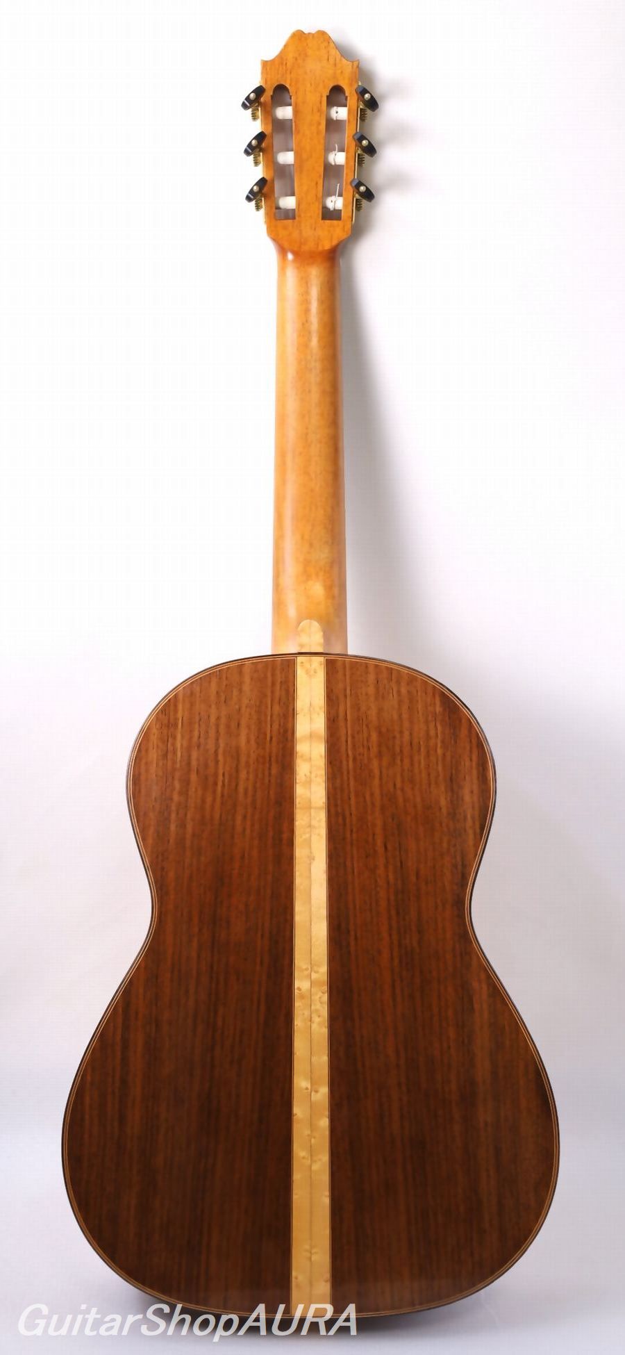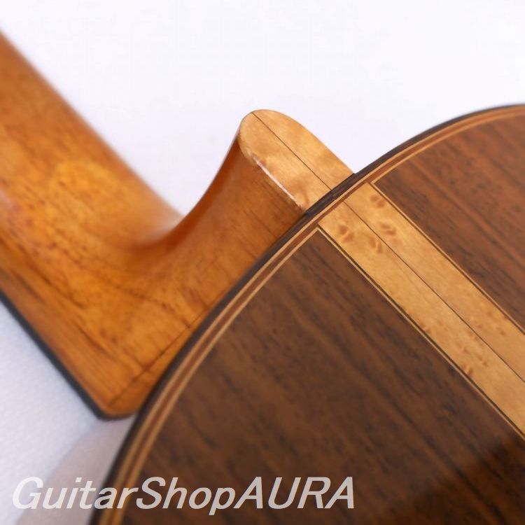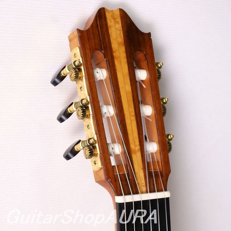 ネック:セドロ指 板:黒檀塗 装:表板 セラック :横裏板 セラック糸 巻:ゴトー弦 高:1弦 2.8mm/6弦 3.7mm〔製作家情報〕1953年生まれ。中学生の頃よりギターを弾き始め、大学の木材工芸科在学中に、その知識を活かして趣味としてギター製作を開始。1980年、グラナダの巨匠アントニオ・マリンの弟子であるアルベルト・ネジメ・オーノ(禰寝孝次郎)氏に師事し、スペイン伝統の製作工法を学び、本格的にギター製作の道へ進む。その後も伝統的な製作技法を追究し続け、2001年にはスペインにて名工ホセ・ルイス・ロマニリョス主宰の製作講習会に参加。また、アントニオ・マリン本人からも製作技術について直接指導を受け、さらに来日したアルカンヘル・フェルナンデスからも、製作に関する貴重な助言と激励を受けている。尾野氏の最大の特徴は、独自の科学的考察に基づく、極めて理論的なスペイン伝統工法の解析と、それを自身の楽器製作へと昇華させている点にある。各楽器個体の最良の鳴りを追求した結果として生み出される、透徹した音響バランスと、雑味のない透明で美しい響きは特筆に値する。また音響面に留まらず、細部にまで行き届いた精緻な造作と、繊細な塗装による外観の気品も比類なく、トータルクオリティにおいて、現在の国内最高峰と言える完成度を誇る楽器を製作している。年間製作本数は約10本。2020年には、フランスの出版社 Camino Verde 刊 Orfeo Magazine No.15 にて、インタビューおよび楽器が紹介された。〔楽器情報〕尾野薫製作 2002年製作 No.136 オリジナルモデルUsedです。表面板全体に弾き傷や打痕等見られ、特にサウンドホール周りはやや集中していますがいずれも細かく浅いものなので外観を著しく損なうものではありません。また表面板は下部低音側ふくらみ部分、駒板低音側上下1カ所と同じく駒板低音側下に1カ所の割れ補修歴がそれぞれありますが、目を近づけてもそれとは判別できないほどの丁寧で精緻な処置が施されており(内側よりパッチ補強あり)、今後の使用に関しては全く問題ありません。横裏板は演奏時に胸や腕が当たる部分に掻き傷や衣類等による細かな摩擦痕があります。ネックは真っすぐを維持しており、ネックシェイプは普通の厚みのDシェイプでフラットな形状、フレットは1~7フレットでやや摩耗見られますが演奏性には問題の無いレベルです。