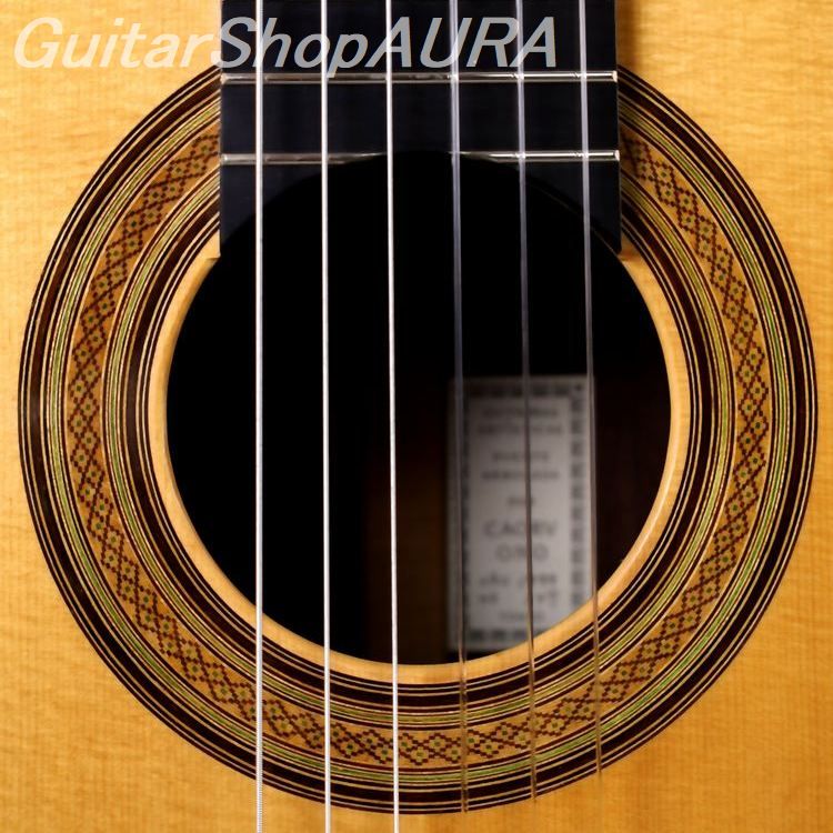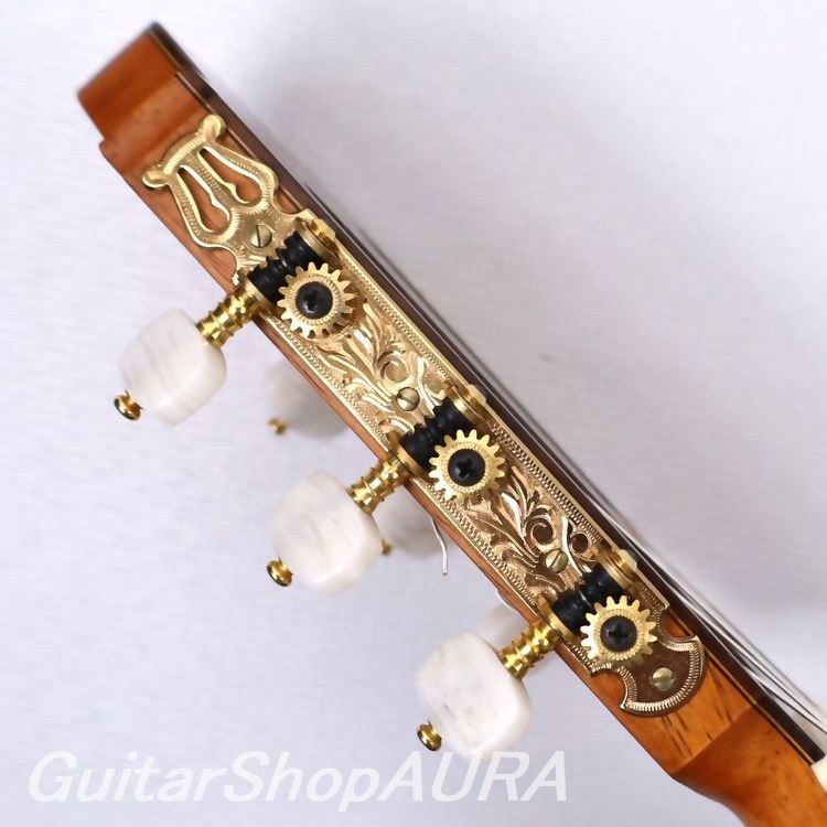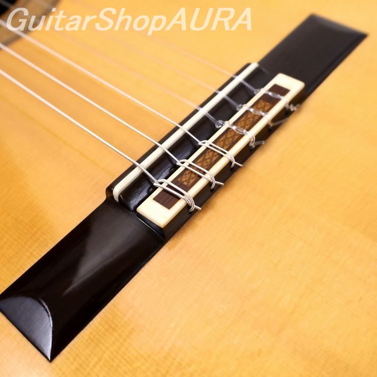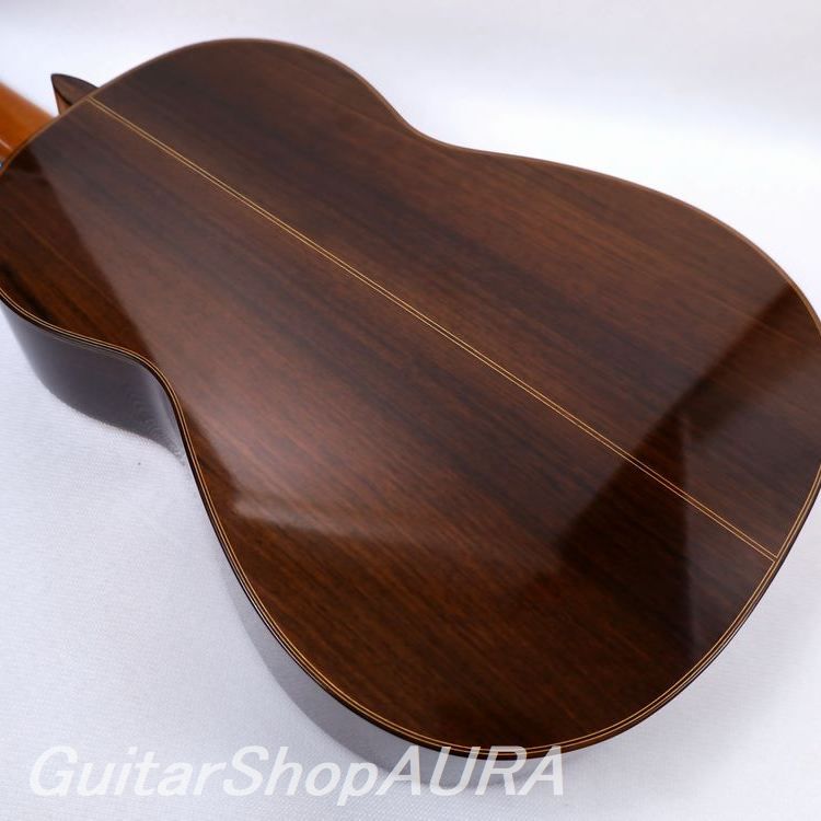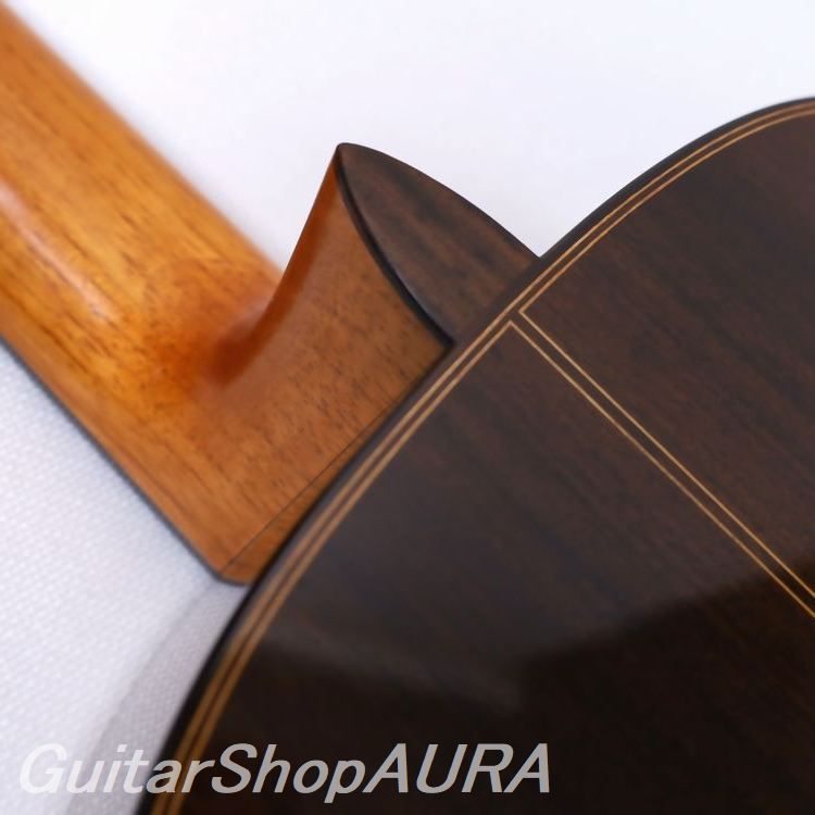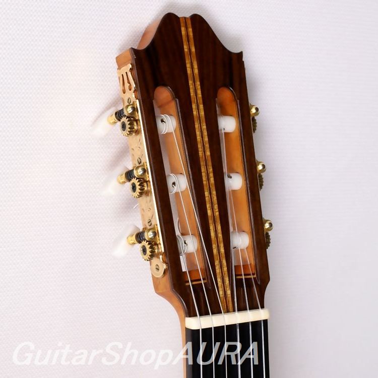 ネック:セドロ指 板:エボニー塗 装:表板/セラック :横裏板/セラック糸 巻:フステーロ弦 高:1弦 3.0mm :6弦 3.6mm〔製作家情報〕1953年生まれ。中学生の頃よりギターを弾き始め、大学の木材工芸科在学中に、その知識を活かして趣味としてギター製作を開始。1980年、グラナダの巨匠アントニオ・マリンの弟子であるアルベルト・ネジメ・オーノ(禰寝孝次郎)氏に師事し、スペイン伝統の製作工法を学び、本格的にギター製作の道へ進む。その後も伝統的な製作技法を追究し続け、2001年にはスペインにて名工ホセ・ルイス・ロマニリョス主宰の製作講習会に参加。また、アントニオ・マリン本人からも製作技術について直接指導を受け、さらに来日したアルカンヘル・フェルナンデスからも、製作に関する貴重な助言と激励を受けている。尾野氏の最大の特徴は、独自の科学的考察に基づく、極めて理論的なスペイン伝統工法の解析と、それを自身の楽器製作へと昇華させている点にある。各楽器個体の最良の鳴りを追求した結果として生み出される、透徹した音響バランスと、雑味のない透明で美しい響きは特筆に値する。また音響面に留まらず、細部にまで行き届いた精緻な造作と、繊細な塗装による外観の気品も比類なく、トータルクオリティにおいて、現在の国内最高峰と言える完成度を誇る楽器を製作している。年間製作本数は約10本。2020年には、フランスの出版社 Camino Verde 刊 Orfeo Magazine No.15 にて、インタビューおよび楽器が紹介された。〔楽器情報〕1999年製作のオリジナルモデル No.107。弦長は650mmで設定されています。柔らかく軽やかな音色が特徴で、高音から低音まで非常にバランスが良く、尾野氏ならではの透明感のある美しい響きを備えています。音量、レスポンス、音の伸びはいずれも過不足のない絶妙なバランスで、弦の張りも柔らかく、演奏性に優れたセッティングです。全面セラックニス仕上げで、糸巻きにはフステーロ製を装着。ネックは真っ直ぐで演奏性は良好、フレットの摩耗もほとんど見られません。弦高は1弦 3.0mm、6弦 3.6mmに調整されており、サドルの余剰も約1.5mm残されているため、今後の調整も可能です。製作から約25年が経過しており、サウンドホール付近の高音側に細かな弾き傷、表面板ボトム部中央付近に擦り傷が見られますが、いずれも浅いもので演奏への影響はありません。割れ等の修理履歴はなく、セラックの変性も見られない良好なコンディションを保っています。アランフェスケース(青)が付属します。