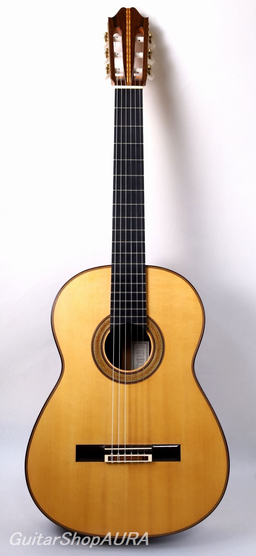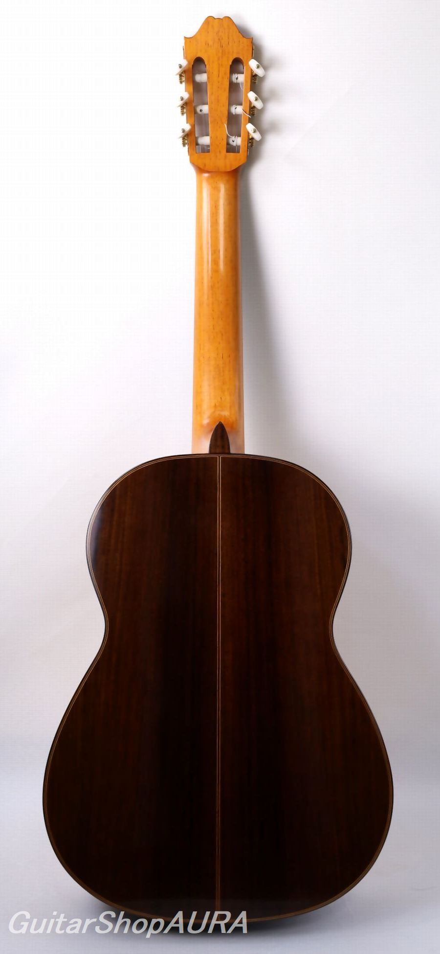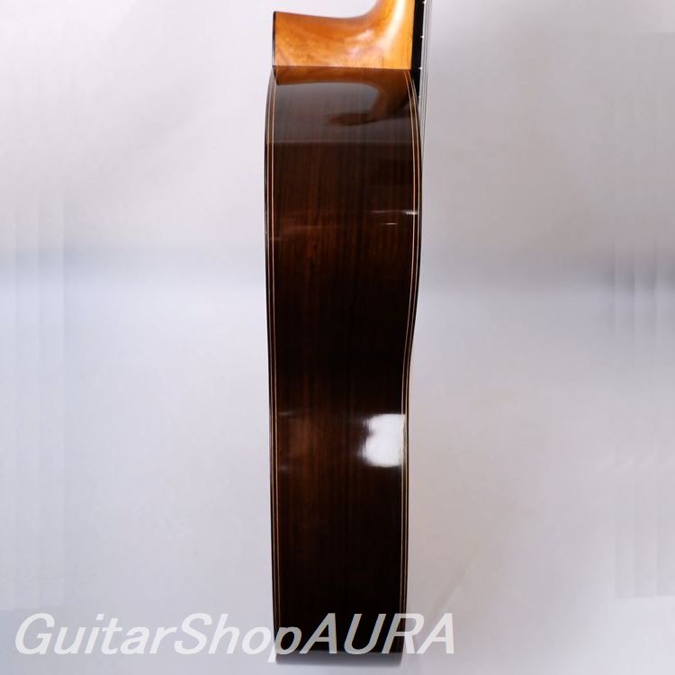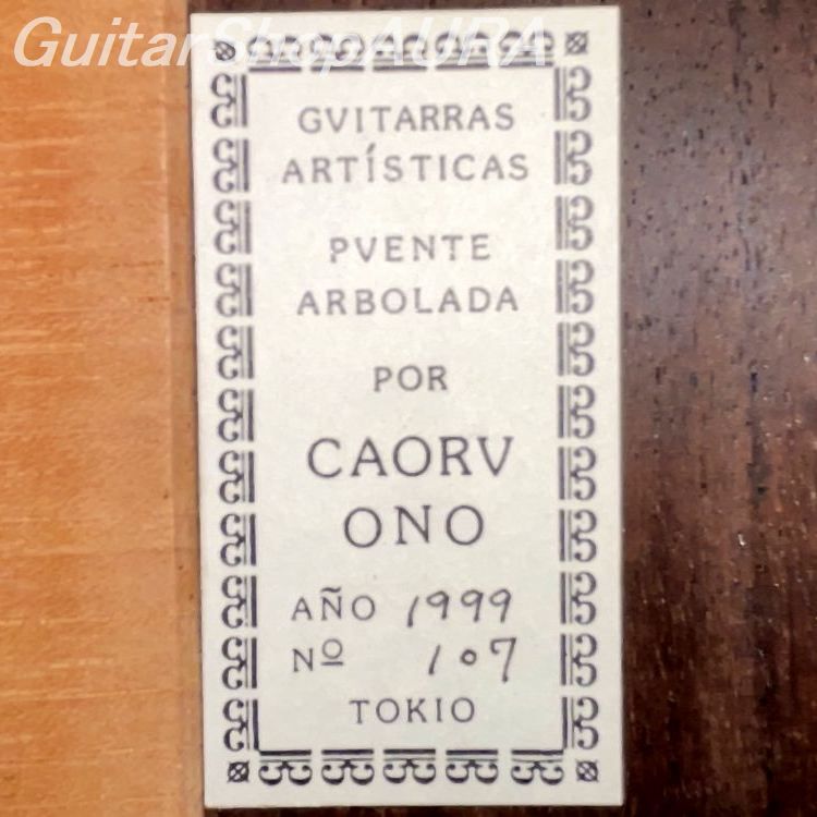 ネック:セドロ指 板:エボニー塗 装:表板/セラック :横裏板/セラック糸 巻:フステーロ弦 高:1弦 3.0mm :6弦 3.6mm〔製作家情報〕1953年生まれ。中学生の頃よりギターを弾き始め、大学の木材工芸科在学中に、その知識を活かして趣味としてギター製作を開始。1980年、グラナダの巨匠アントニオ・マリンの弟子であるアルベルト・ネジメ・オーノ(禰寝孝次郎)氏に師事し、スペイン伝統の製作工法を学び、本格的にギター製作の道へ進む。その後も伝統的な製作技法を追究し続け、2001年にはスペインにて名工ホセ・ルイス・ロマニリョス主宰の製作講習会に参加。また、アントニオ・マリン本人からも製作技術について直接指導を受け、さらに来日したアルカンヘル・フェルナンデスからも、製作に関する貴重な助言と激励を受けている。尾野氏の最大の特徴は、独自の科学的考察に基づく、極めて理論的なスペイン伝統工法の解析と、それを自身の楽器製作へと昇華させている点にある。各楽器個体の最良の鳴りを追求した結果として生み出される、透徹した音響バランスと、雑味のない透明で美しい響きは特筆に値する。また音響面に留まらず、細部にまで行き届いた精緻な造作と、繊細な塗装による外観の気品も比類なく、トータルクオリティにおいて、現在の国内最高峰と言える完成度を誇る楽器を製作している。年間製作本数は約10本。2020年には、フランスの出版社 Camino Verde 刊 Orfeo Magazine No.15 にて、インタビューおよび楽器が紹介された。〔楽器情報〕1999年製作のオリジナルモデル No.107。弦長は650mmで設定されています。柔らかく軽やかな音色が特徴で、高音から低音まで非常にバランスが良く、尾野氏ならではの透明感のある美しい響きを備えています。音量、レスポンス、音の伸びはいずれも過不足のない絶妙なバランスで、弦の張りも柔らかく、演奏性に優れたセッティングです。全面セラックニス仕上げで、糸巻きにはフステーロ製を装着。ネックは真っ直ぐで演奏性は良好、フレットの摩耗もほとんど見られません。弦高は1弦 3.0mm、6弦 3.6mmに調整されており、サドルの余剰も約1.5mm残されているため、今後の調整も可能です。製作から約25年が経過しており、サウンドホール付近の高音側に細かな弾き傷、表面板ボトム部中央付近に擦り傷が見られますが、いずれも浅いもので演奏への影響はありません。割れ等の修理履歴はなく、セラックの変性も見られない良好なコンディションを保っています。アランフェスケース(青)が付属します。
