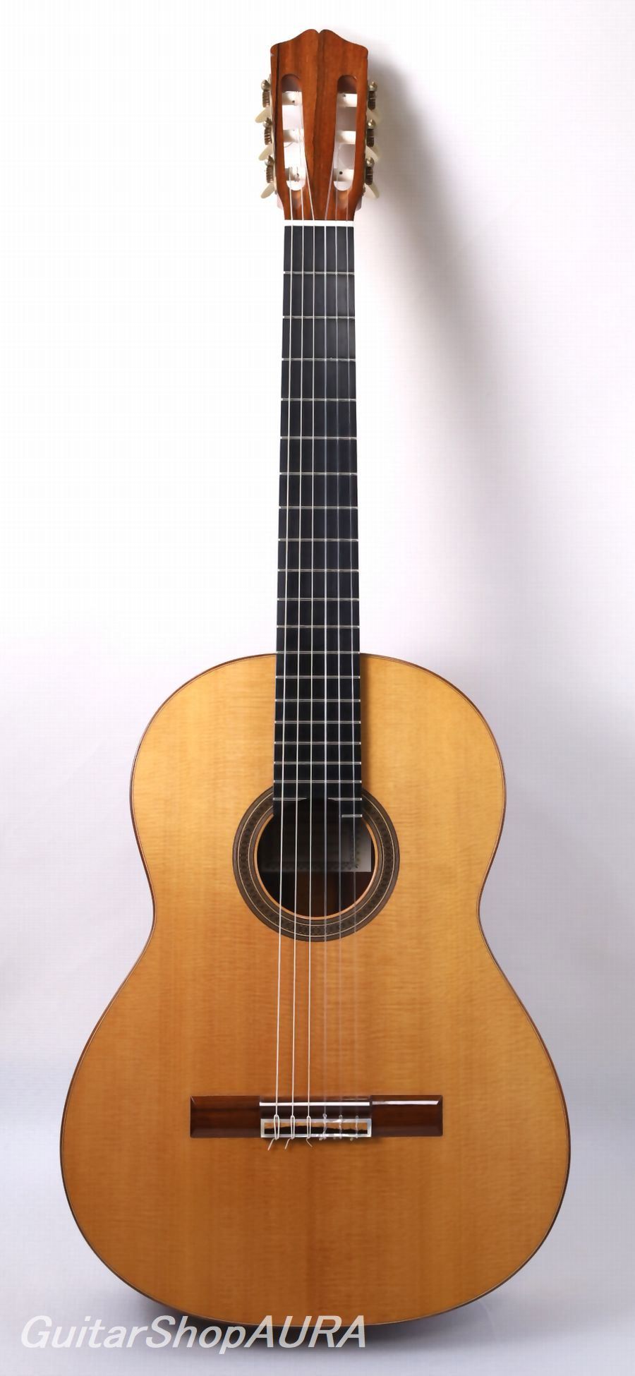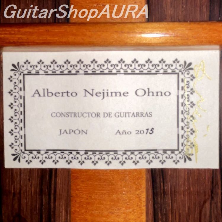 アルベルト・ネジメ・オーノ Alberto Nejime Ohno(禰寝孝次郎)1952年生まれ。1979年にスペインに留学し、グラナダの名工アントニオ・マリンにギター製作を師事。2年に及ぶその期間中彼はほとんど家族の一員のようにして製作を共にし、単に技法の習得だけではなくその土地の文化風土や人間性をも吸収しながらスペインの伝統工法を学んでいます。帰国後に発表した彼の楽器は、感性的な領域にまで深くスペインのニュアンスを染み込ませた逸品として、国内では初めての本格的なスパニッシュギターと評価されるようになります。1988年にはチェコスロバキア・クツナホラ国際ギター製作コンクールにてグランプリを受賞し、国際的にもその実力は高く評価されるようになります。他の追従を許さぬ美しく気品のある外観の仕上がりと、重厚かつ濃密で艶やかな音色と十分な遠達性を備えた作風は近年益々円熟味を加え、師のアントニオ・マリン同様にマニア垂涎の楽器として、現在その評価は不動のものとなっています。また製作と同時に後進の指導や執筆活動にも尽力し、 第一回アマチュアギター製作コンテスト審査員、スペインにて第7回コリアギター講習会参加、ギター製作家in八郷審査員をつとめるなどのほか、雑誌<現代ギター>に「君もギタービルダー」を連載、愛好家からの大きな反響を得て「スペイン式クラシックギター製作法」として書籍化されています。2020年にはフランスの出版社Camino Verde刊 Orfeo Magazine No.15で彼のインタビューと楽器が紹介されました。