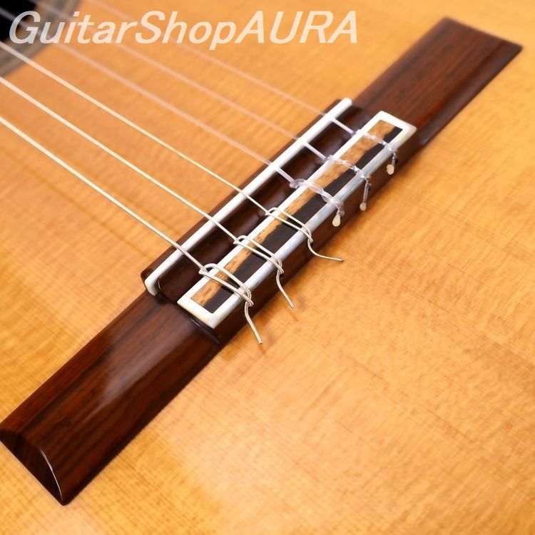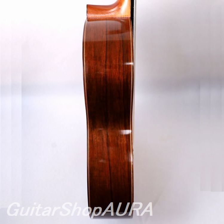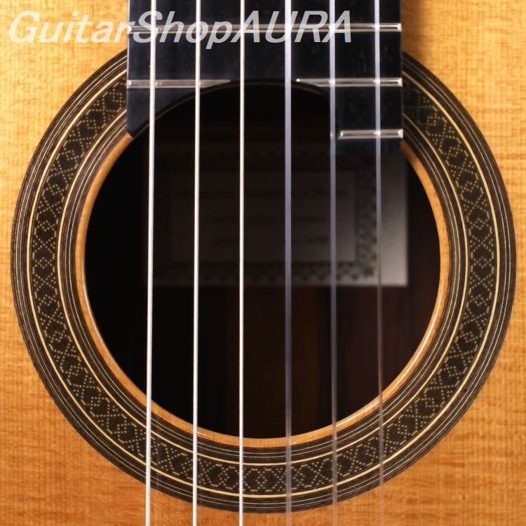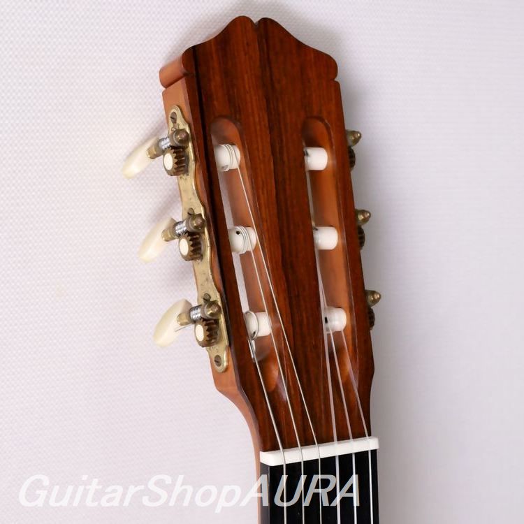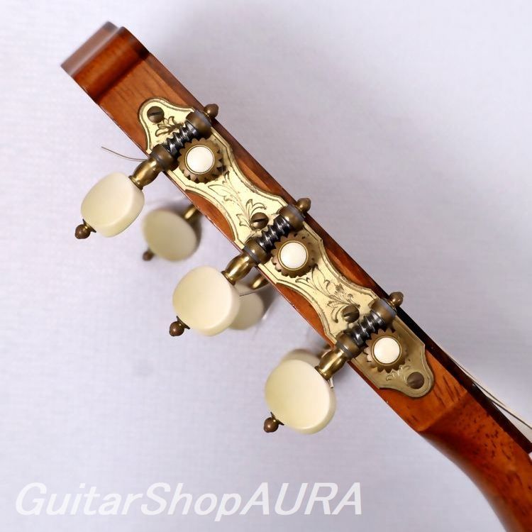 全体はセラック塗装仕様で過去に再塗装等の履歴はありません。表面板は指板両脇やサウンドホール付近、駒板下部分などにそれぞれ数か所の浅く軽微な1~2cmほどの搔きキズがあります。横裏板はとてもきれいな状態を維持しています。割れや改造などの大きな修理歴はありません。ネックはとても良い状態を維持しており、フレットは1~2フレットでほんのわずかに摩耗見られますが演奏性には影響ありません。ネック形状は普通の厚みのDシェイプ、弦高値は2.4/3.2mm(1弦/6弦 12フレット)とクラシックとしてはかなり低めの設定でサドル余剰は0.5~1.0mmとなっています。指板は高音側20フレット仕様、指板脇には5フレットと7フレットにポジションマークがあります。糸巻はイタリア製高級ブランドのAlessi 製を装着しており現在機能的な問題はありません。重量は1.67㎏。