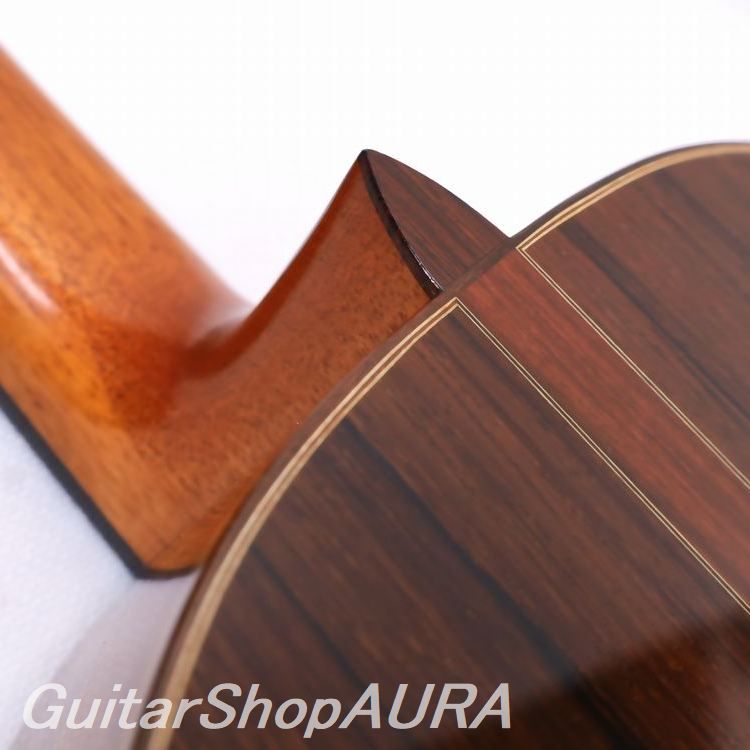 アルベルト・ネジメ・オーノ(禰寝孝次郎)製作のサントス・エルナンデスモデル 2015年製 Usedです。その名の通り名工サントス後期の特徴的なヘッドシェイプを採用していますが、内部構造そしてその音響的特性は禰寝氏のオリジナルのものとなっています。本器が作られた2015年より数年後からは楽器が顕著に重量化し、ストイックさとロマンティシズムが異様なまでの密度で音響化した豪壮なギターへと変化してゆきますが、本作はそれに先立つ、ある種の繊細な美しささえ感じさせる一本となっています。