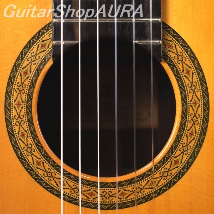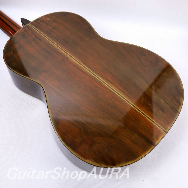 ネック:マホガニー指 板:黒檀塗 装:表板 カシュー :横裏板 カシュー糸 巻:ホフナー弦 高:1弦 3.5mm/6弦 4.2mm〔製作家情報〕1926年茨城県水戸に生まれる。1948年3月東京高等工芸学校木材工芸科(現千葉大学建築科)卒業と同時にギター製作を開始。1960年5月スペインに渡りギター製作を学ぶ。1967年9月ベルギーに於ける国際ギターコンクールで金メダル受賞。日本における高級ギター製作のパイオニア的存在であり、当時も今も非常にファンの多い国内ブランドです。高い工作精度による美しい外観、弾き易く常に安定感があり、また何よりも日本人の嗜好に音色と演奏性の両面で合致したギターは、海外からも国産ブランドの筆頭として高い評価を得ています。〔楽器情報〕1977年製作のNo.20です。弦長660mmで設定されています。重厚感のある鳴りが特徴で、選択できる音色は幅広く、河野賢ならではのどっしりとした響きと太く艶やかな単音を備えています。音量は普通ながら、レスポンスは良好で音の伸びも十分。全体のバランスも良く、タッチの許容範囲が広いため弾きやすい設定です。このブランドらしい、適度にロマンティックな表情を持ち、日本人の嗜好に音色と演奏性の両面で合致した一本です。カシュー塗装仕上げで、糸巻きにはホフナー製を装着。ネックは真っ直ぐで演奏性は良好、フレットの摩耗もほぼありません。弦高値は1弦3.5mm、6弦4.2mmで調整されており、弦の張りは比較的強めながら、弾きやすさは確保されています。製作から47年が経過した楽器としては良好な状態を保っています。表面板低音弦側ネック付近に浅い打痕一か所、ボトム部に浅い打痕数か所、高音弦側サウンドホール付近に弾き傷がありますが、いずれも演奏使用によるもの。年代的に古い楽器のため、横裏板エッジ部分がわずかに変色していますが、割れ等の修理履歴はなく良好な状態です。ハードケース(黒)が付属します。