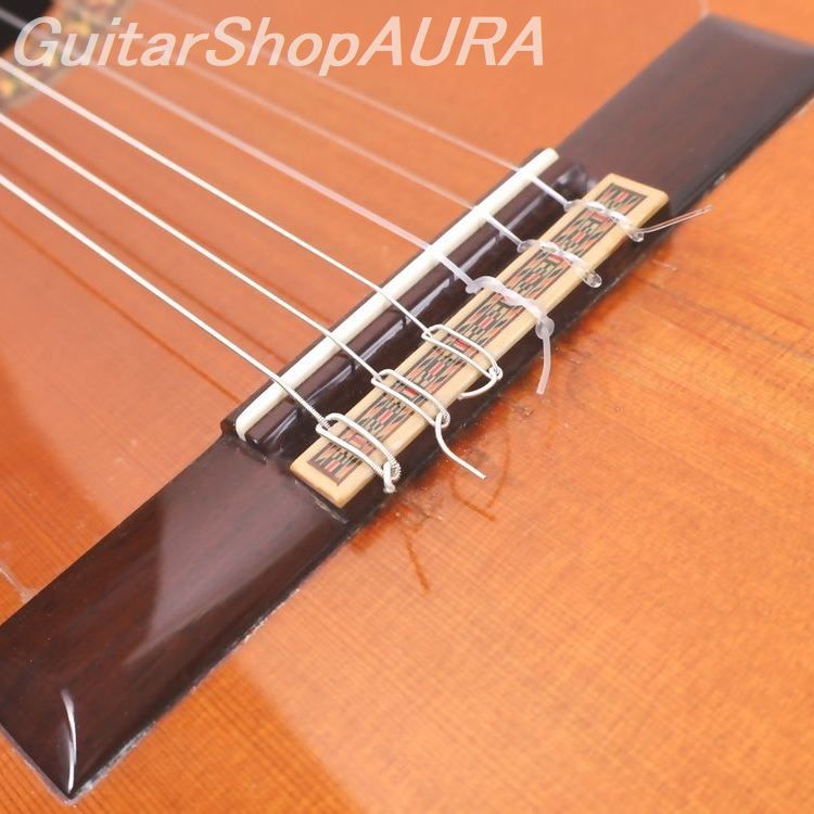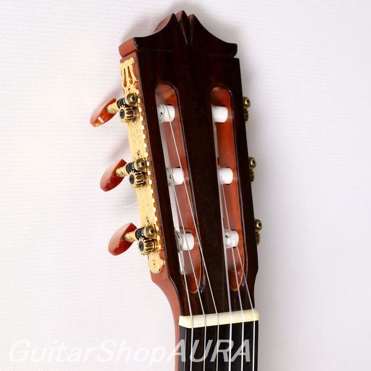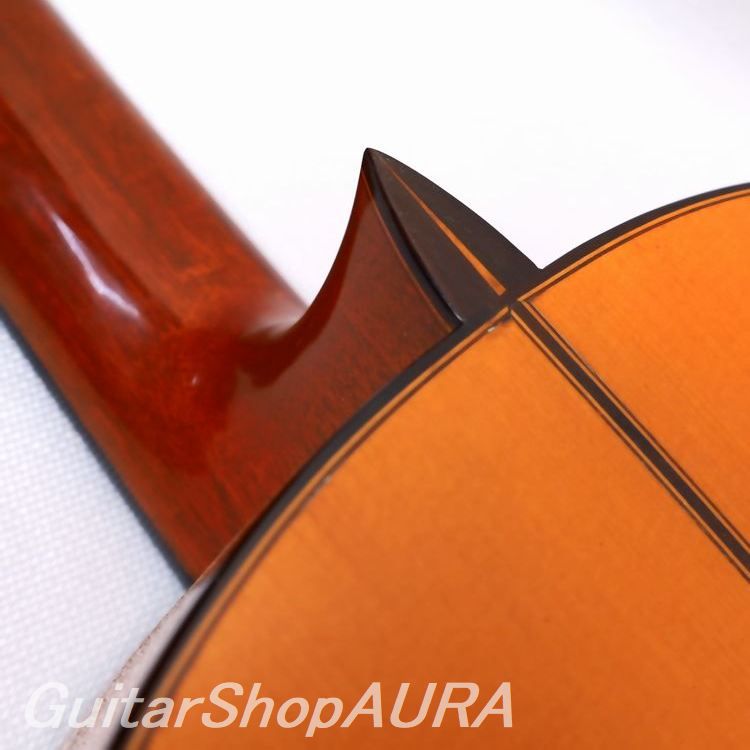 製作から50年以上を経たフラメンコモデルとして、やはり表面板には指板脇高音側や駒板下高音側に割れの修理歴、駒下の弦とび跡が1~6弦すべてにあるなどそれなりの使用感はありますが、意外にも弾きキズや打痕などは少な目で、横裏板に関しても演奏時に胸や腕の当たる部分などに衣服等によるスクラッチ痕や部分的な塗装のムラ等見られるものの外観を著しく損ねるものではありません。割れの補修は接着とタッチアップのみで内側からの補強はされておりません。ネックはほぼ真直ぐを維持しており、フレットも1~3フレットでわずかに摩耗していますが演奏性には影響ありません。ネックシェイプはDシェイプでフラメンコとしてはわずかに厚みのある形状。弦高値は2.3/2.6mm(1弦/6弦 12フレット)でサドル余剰は1.0mmあります。糸巻はGotoh製に交換されており、現状に機能は良好です。弦高低めですが、ブリッジ寄りの位置の弾弦でフラメンコとしては問題なく演奏できます。