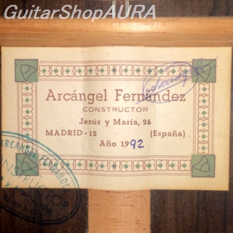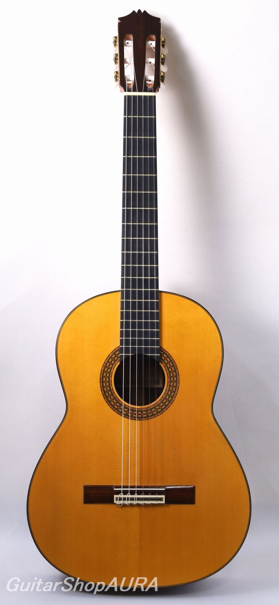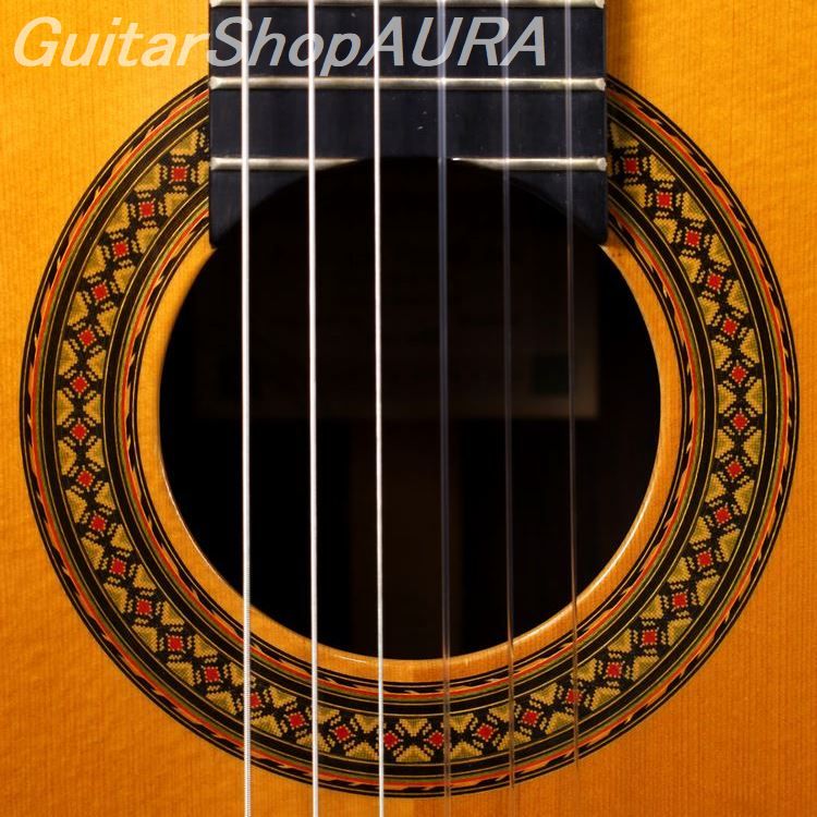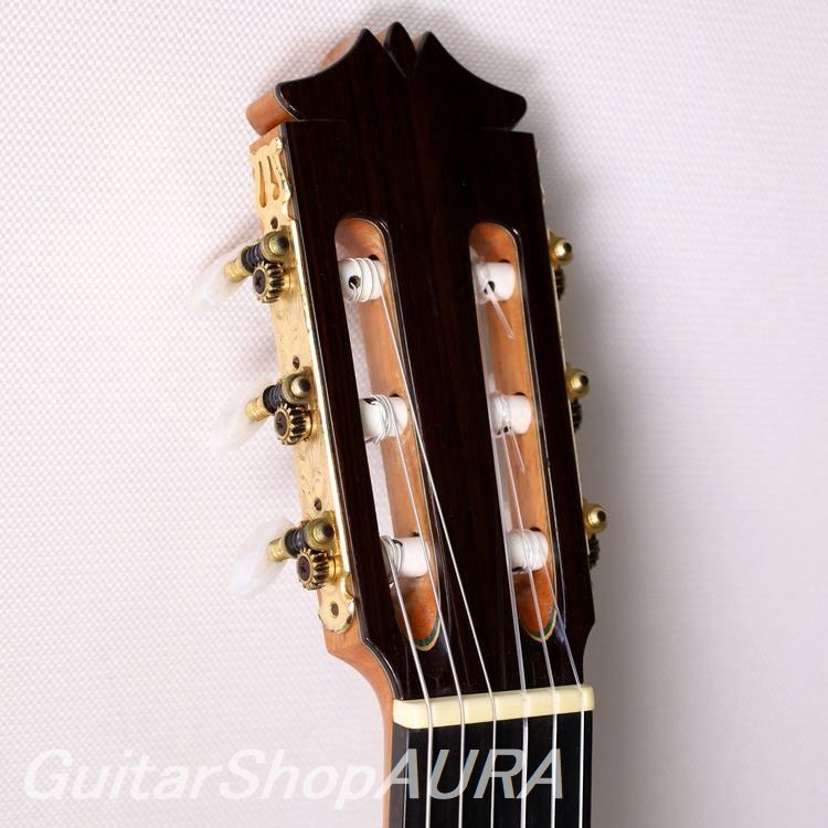 Finished in shellac (French polish), it is fitted with Fustero tuning machines. The neck is slightly thicker than standard, yet remains comfortable and highly playable. There is minimal fret wear, and the string height is set at 2.6 mm on the 1st string and 3.4 mm on the 6th string. The string tension feels soft, allowing a wide margin of control in touch, making it very easy to play.